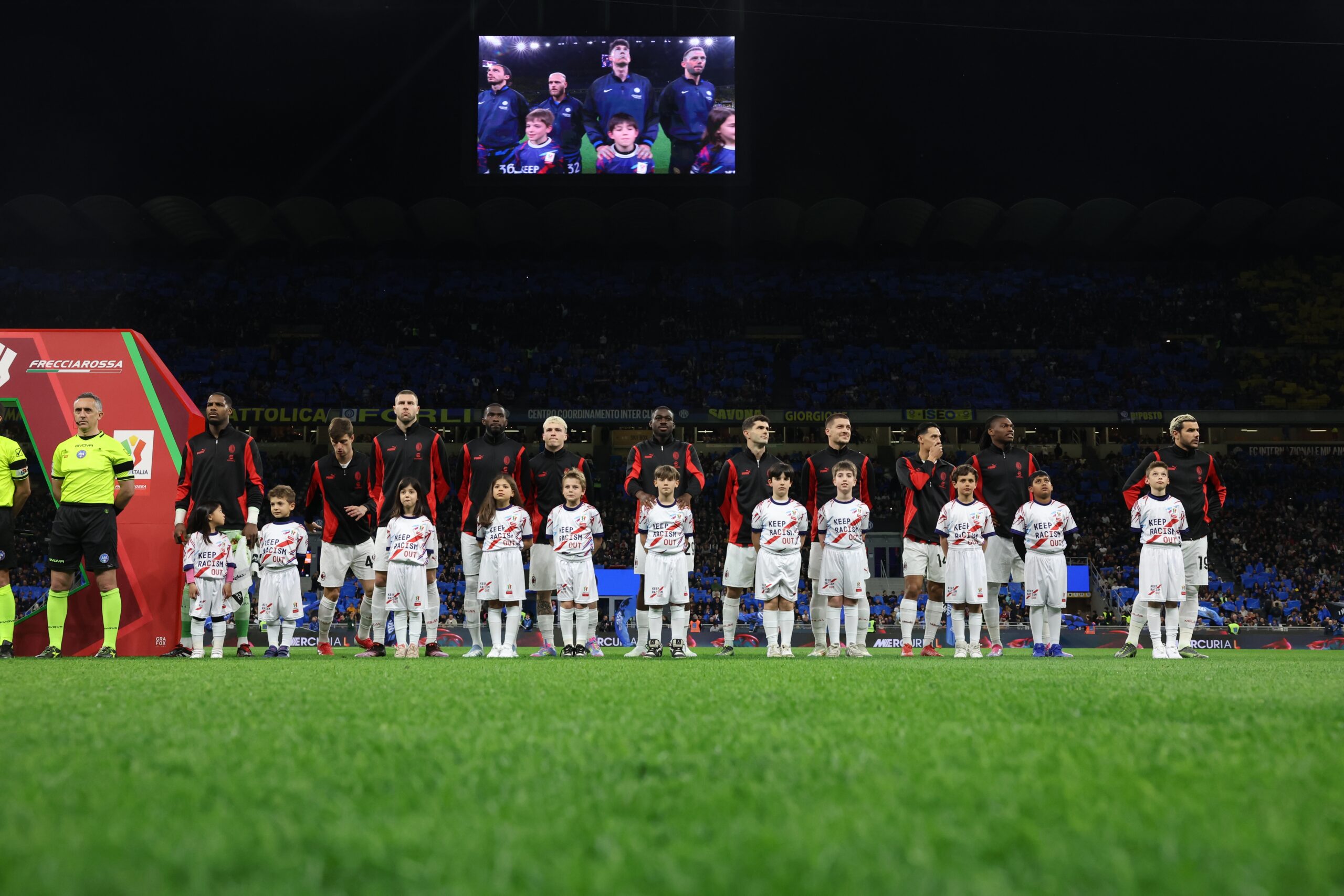 MILAN, ITALY - APRIL 23: A minute of silence for Pope Francesco before the coppa Italia Semi Final match between FC Internazionale and AC Milan at Stadio Giuseppe Meazza on April 23, 2025 in Milan, Italy. (Photo by Claudio Villa/AC Milan via Getty Images)