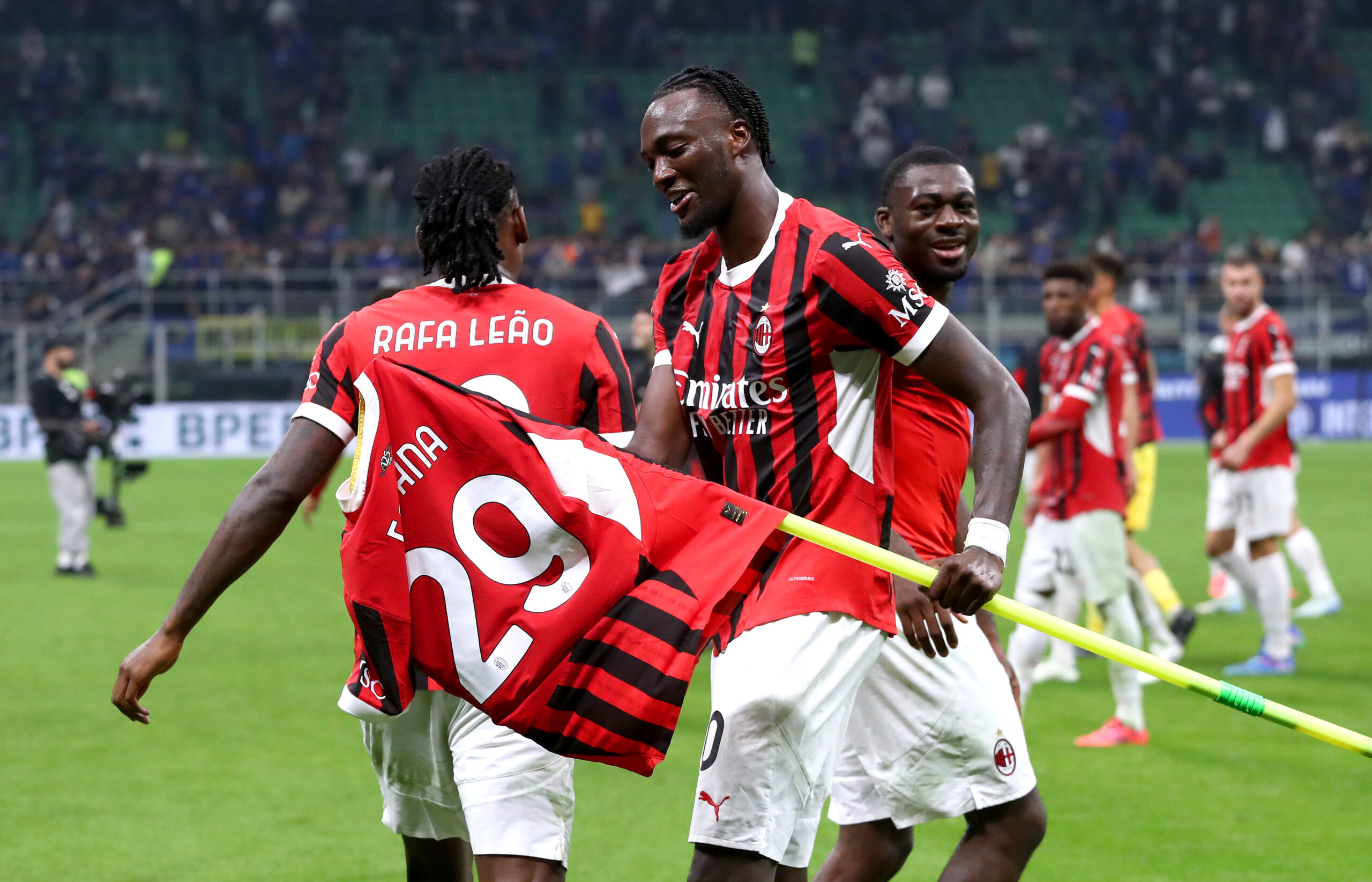 MILAN, ITALY - SEPTEMBER 22: Tammy Abraham of AC Milan attaches the shirt of Youssouf Fofana to the corner flag after during the Serie A match between FC Internazionale and AC Milan at Stadio Giuseppe Meazza on September 22, 2024 in Milan, Italy. (Photo by Marco Luzzani/Getty Images)