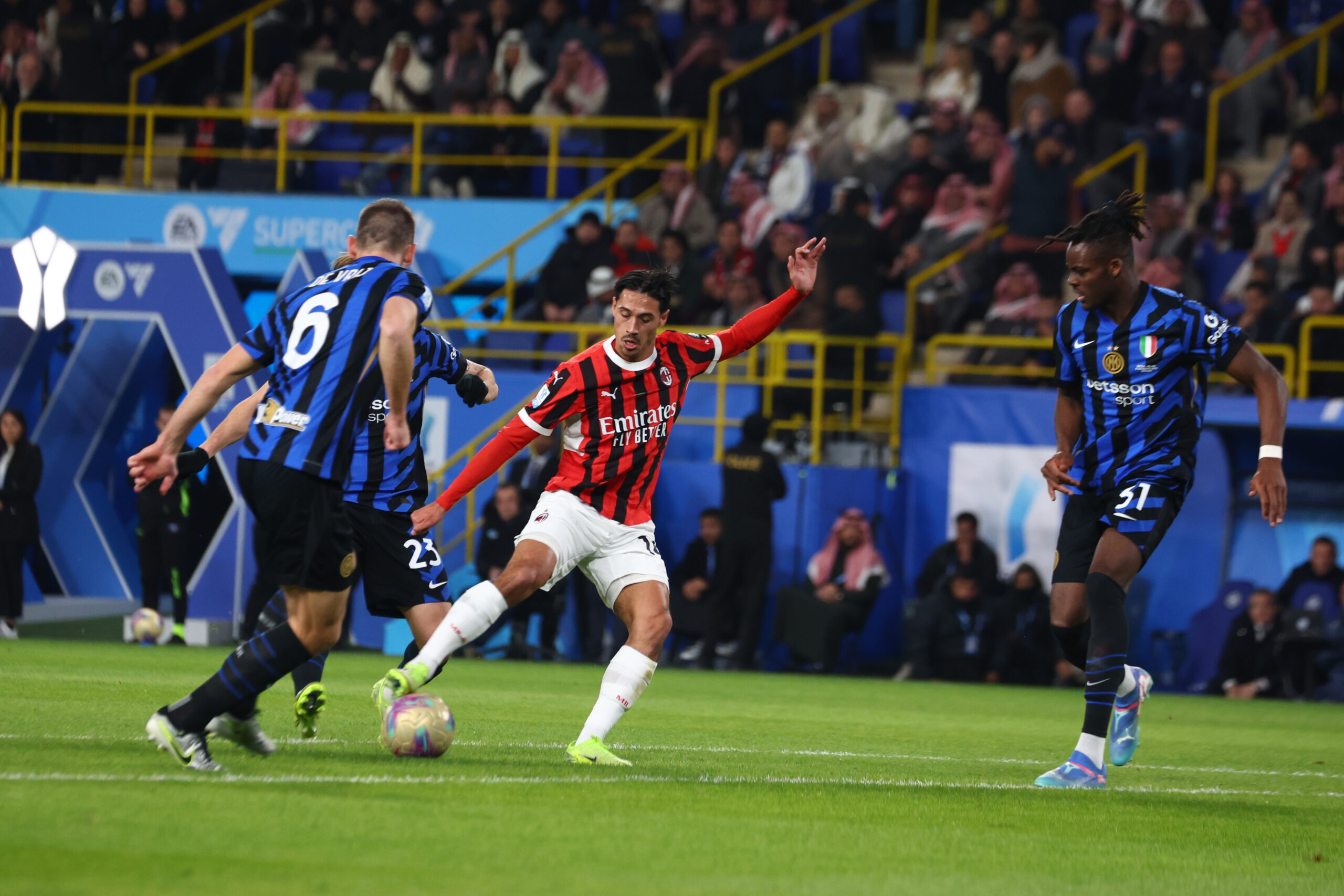 RIYADH, SAUDI ARABIA - JANUARY 06: Tijjani Reijnders of AC Milan is challenged by Stefan De Vrij and Yann Aurel Bisseck of FC Internazionale during the Italian Super Cup Final match between FC Internazionale and AC Milan at the Al Awwal Park Stadium on January 06, 2025 in Riyadh, Saudi Arabia. (Photo by Giuseppe Cottini/AC Milan via Getty Images)