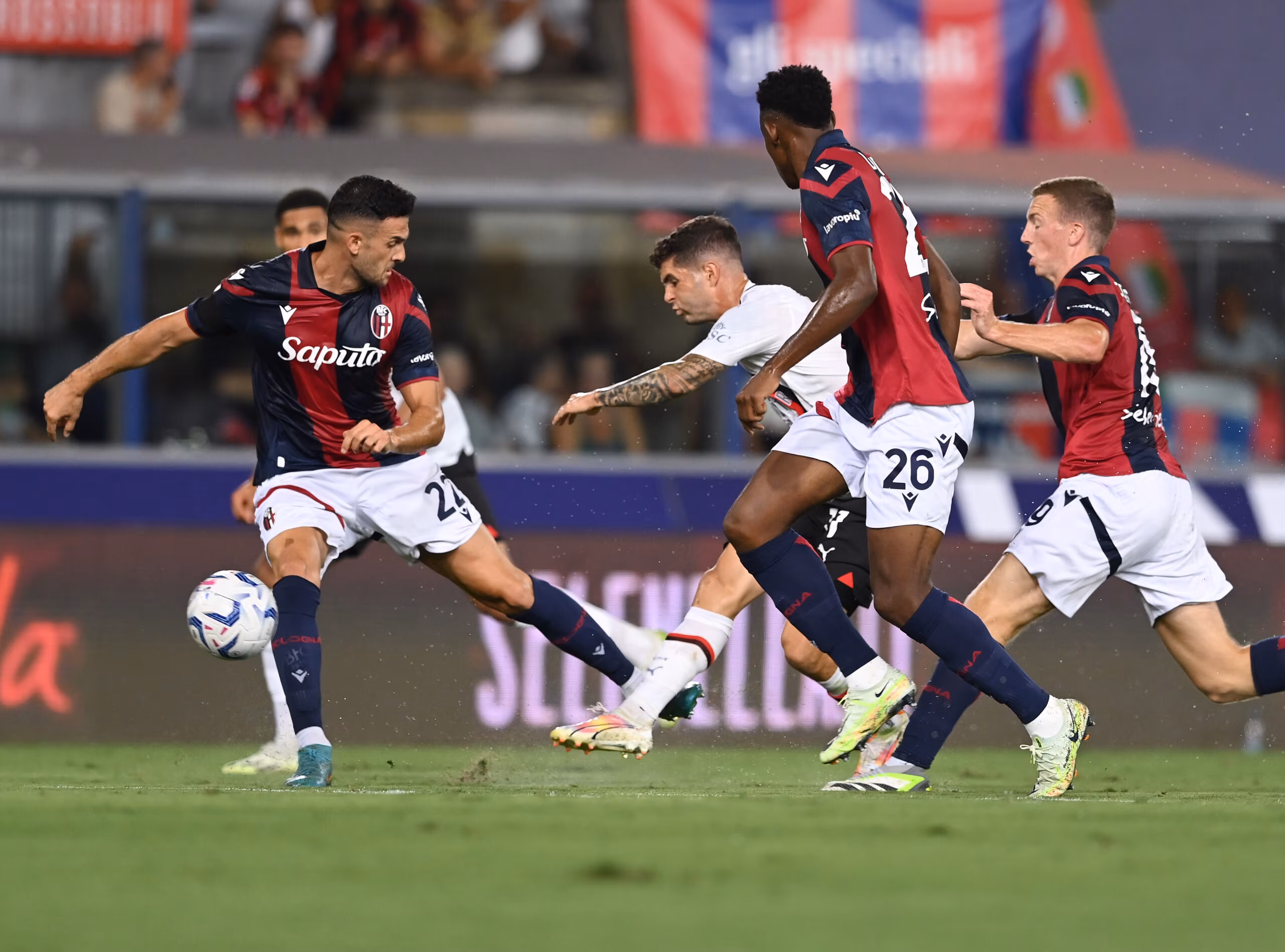 BOLOGNA, ITALY - AUGUST 21: Christian Pulisic of AC Milan scores the second goal during the Serie A TIM match between Bologna FC and AC Milan at Stadio Renato Dall'Ara on August 21, 2023 in Bologna, Italy. (Photo by Claudio Villa/AC Milan via Getty Images)
