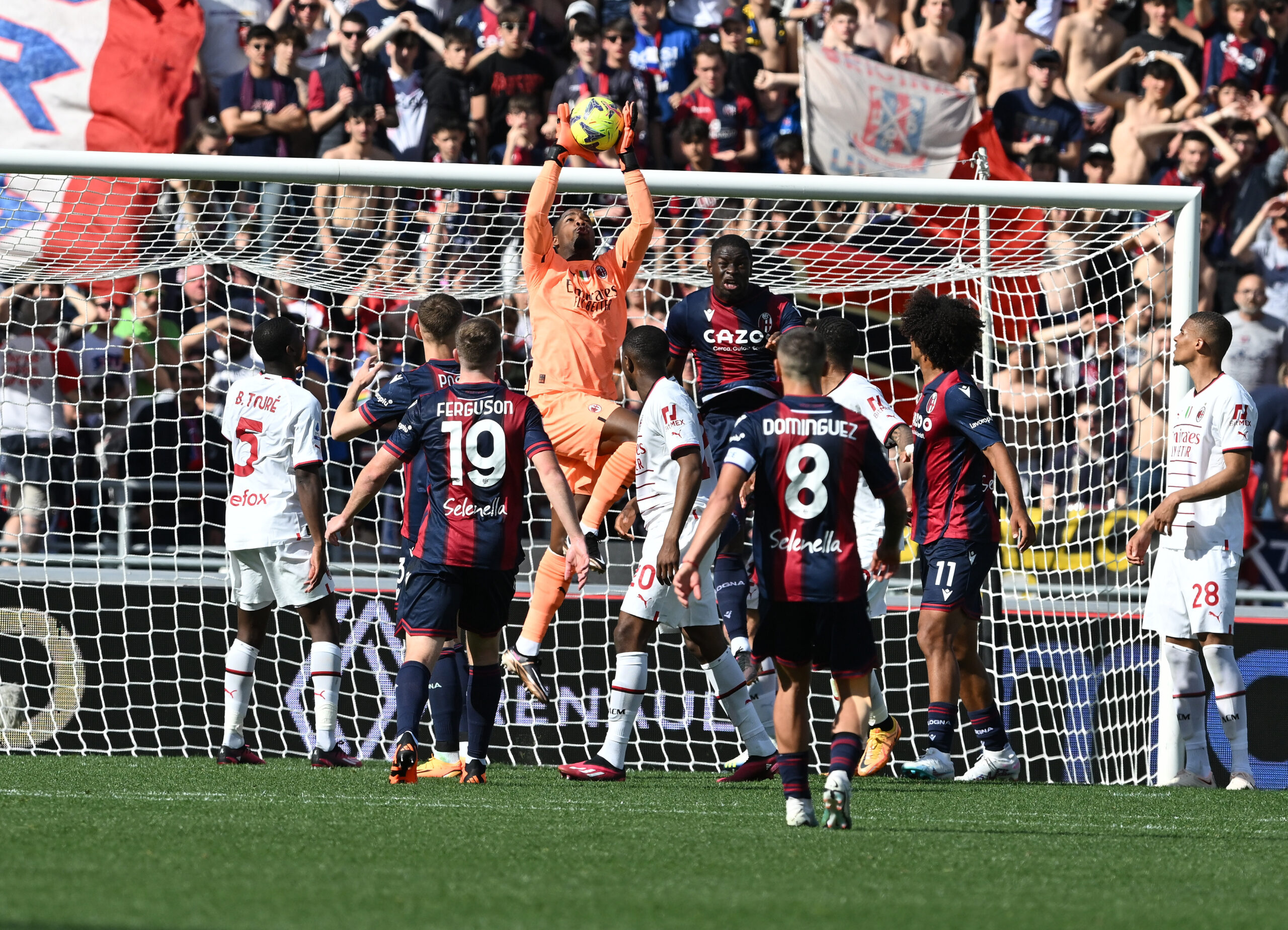 BOLOGNA, ITALY - APRIL 15: Mike Maignan of AC Milan in action during the Serie A match between Bologna FC and AC Milan at Stadio Renato Dall'Ara on April 15, 2023 in Bologna, Italy. (Photo by Claudio Villa/AC Milan via Getty Images)