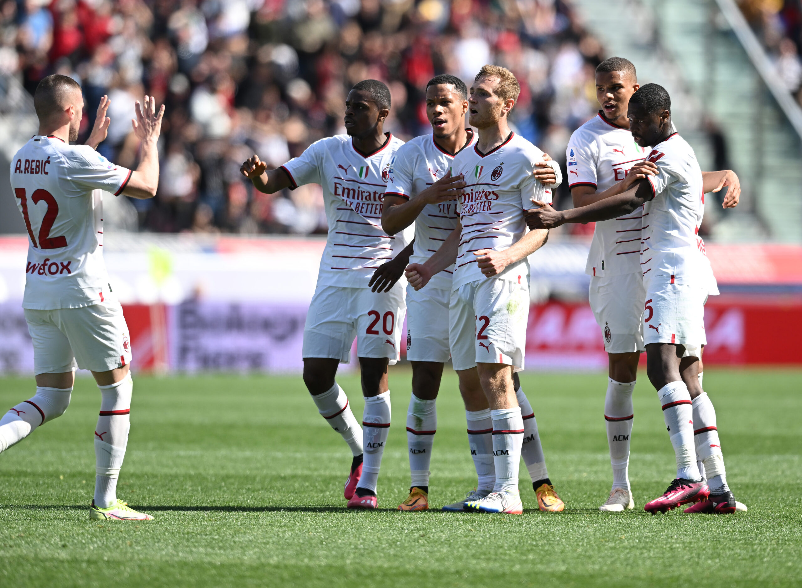 BOLOGNA, ITALY - APRIL 15: Tommas Pobega of AC Milan celebrtaes with team-mates after scoring the goal during the Serie A match between Bologna FC and AC Milan at Stadio Renato Dall'Ara on April 15, 2023 in Bologna, Italy. (Photo by Claudio Villa/AC Milan via Getty Images)