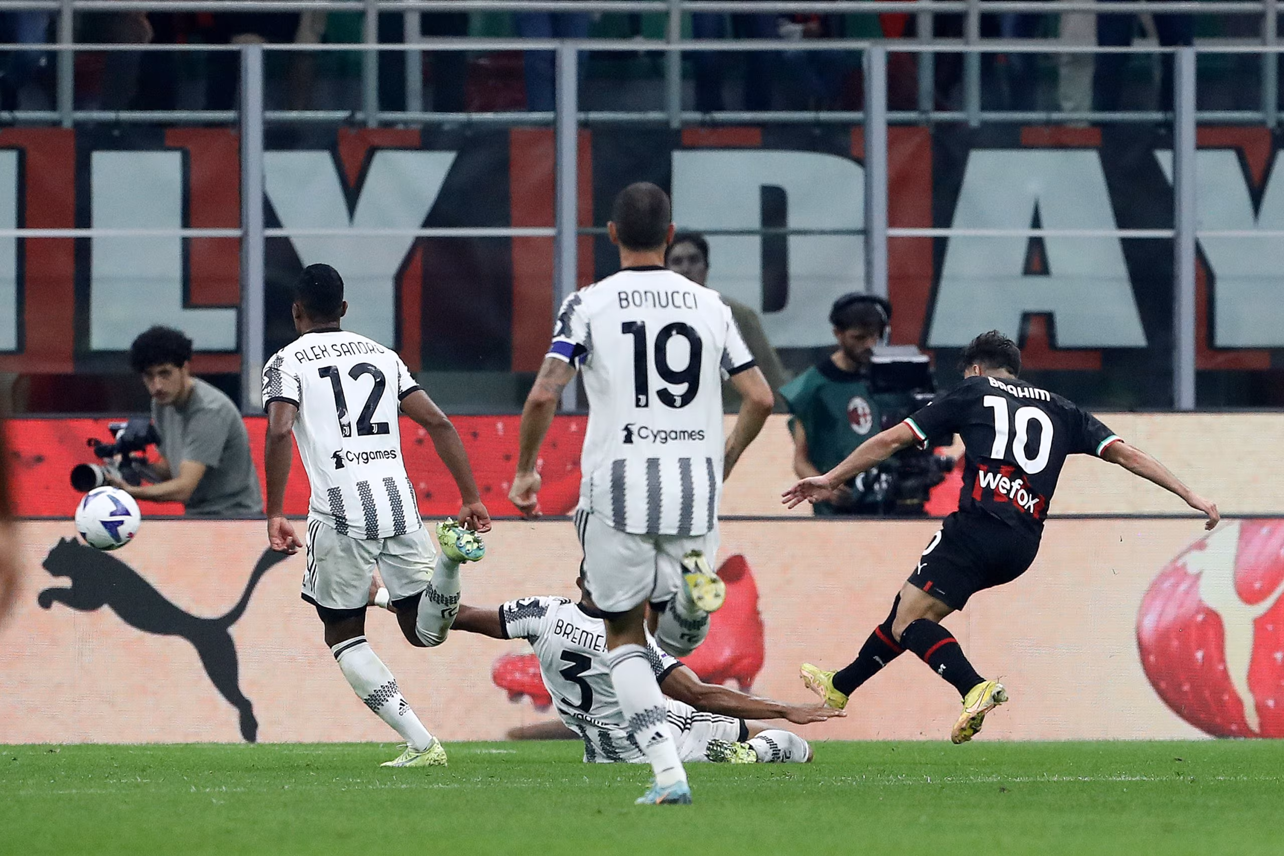 MILAN, ITALY - OCTOBER 08: Brahim Diaz of AC Milan scores their side's second goal whilst under pressure from Bremer of Juventus during the Serie A match between AC Milan and Juventus at Stadio Giuseppe Meazza on October 08, 2022 in Milan, Italy. (Photo by Marco Luzzani/Getty Images)