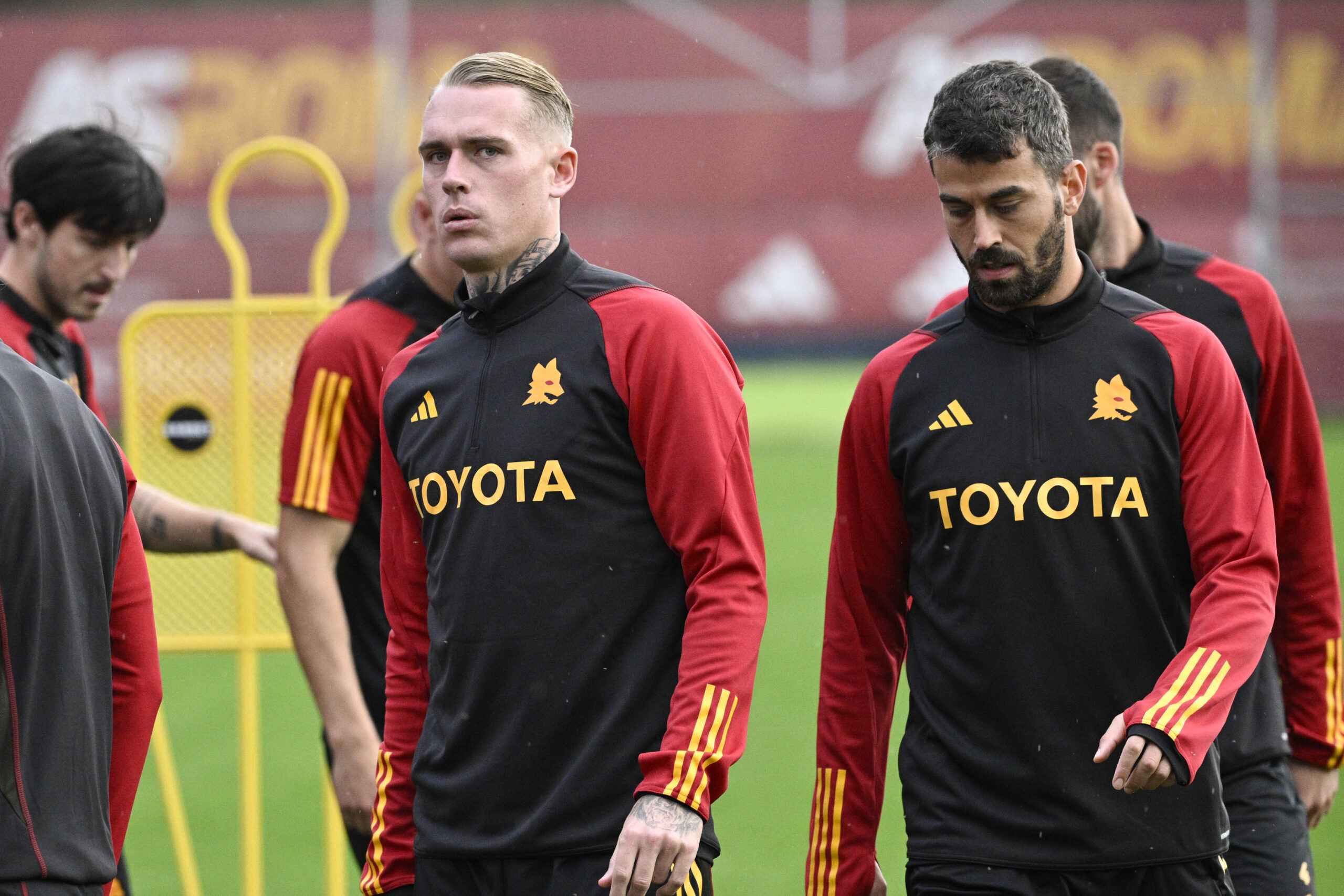 ROME, ITALY - OCTOBER 21: AS Roma players Rick Karsdorp and Leonardo Spinazzola during training session at Centro Sportivo Fulvio Bernardini on October 21, 2023 in Rome, Italy. (Photo by Luciano Rossi/AS Roma via Getty Images)