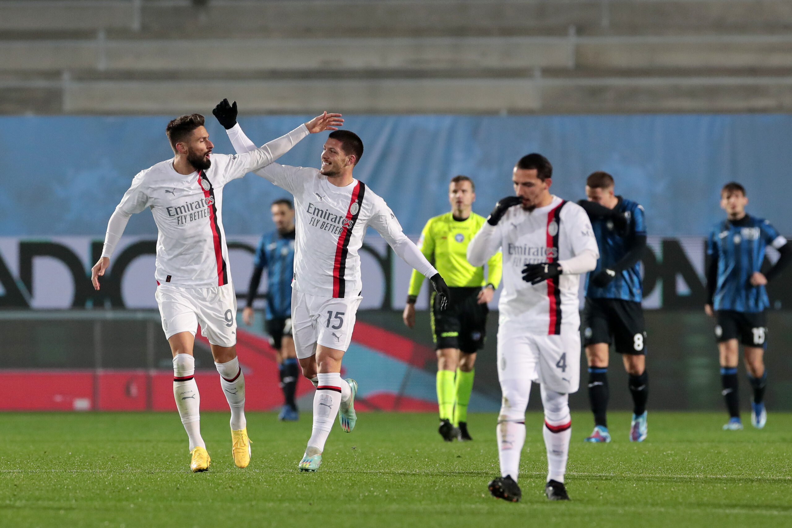 BERGAMO, ITALY - DECEMBER 09: Luka Jovic of AC Milan celebrates with teammate Olivier Giroud (L) after scoring their team's second goal during the Serie A TIM match between Atalanta BC and AC Milan at Gewiss Stadium on December 09, 2023 in Bergamo, Italy. (Photo by Emilio Andreoli/Getty Images)
