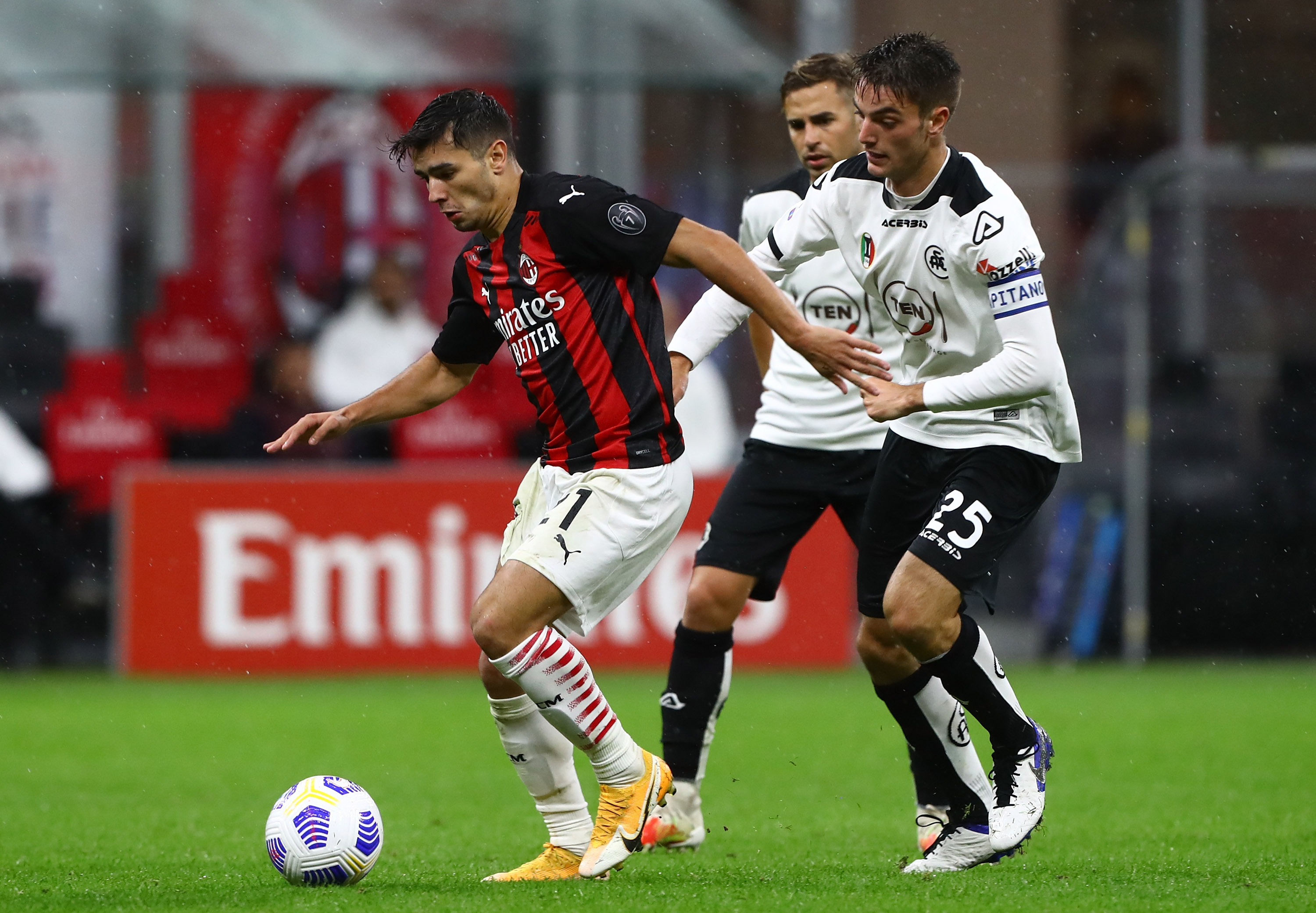 MILAN, ITALY - OCTOBER 04: Diaz Brahim of AC Milan competes for the ball with Giulio Maggiore of Spezia Calcio during the Serie A match between AC Milan and Spezia Calcio at Stadio Giuseppe Meazza on October 4, 2020 in Milan, Italy. (Photo by Marco Luzzani/Getty Images)
