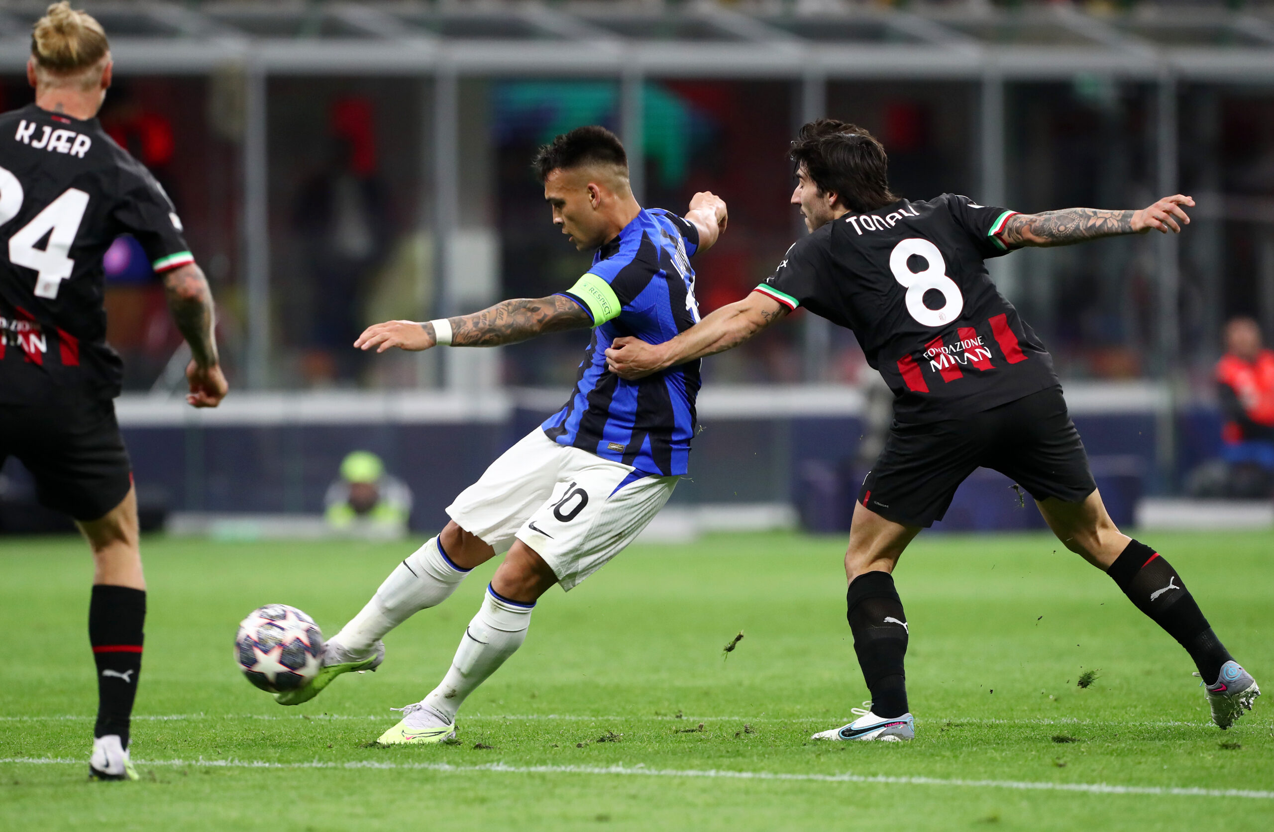 MILAN, ITALY - MAY 10: Lautaro Martinez of FC Internazionale shoots whilst under pressure from Sandro Tonali of AC Milan during the UEFA Champions League semi-final first leg match between AC Milan and FC Internazionale at San Siro on May 10, 2023 in Milan, Italy. (Photo by Marco Luzzani/Getty Images)