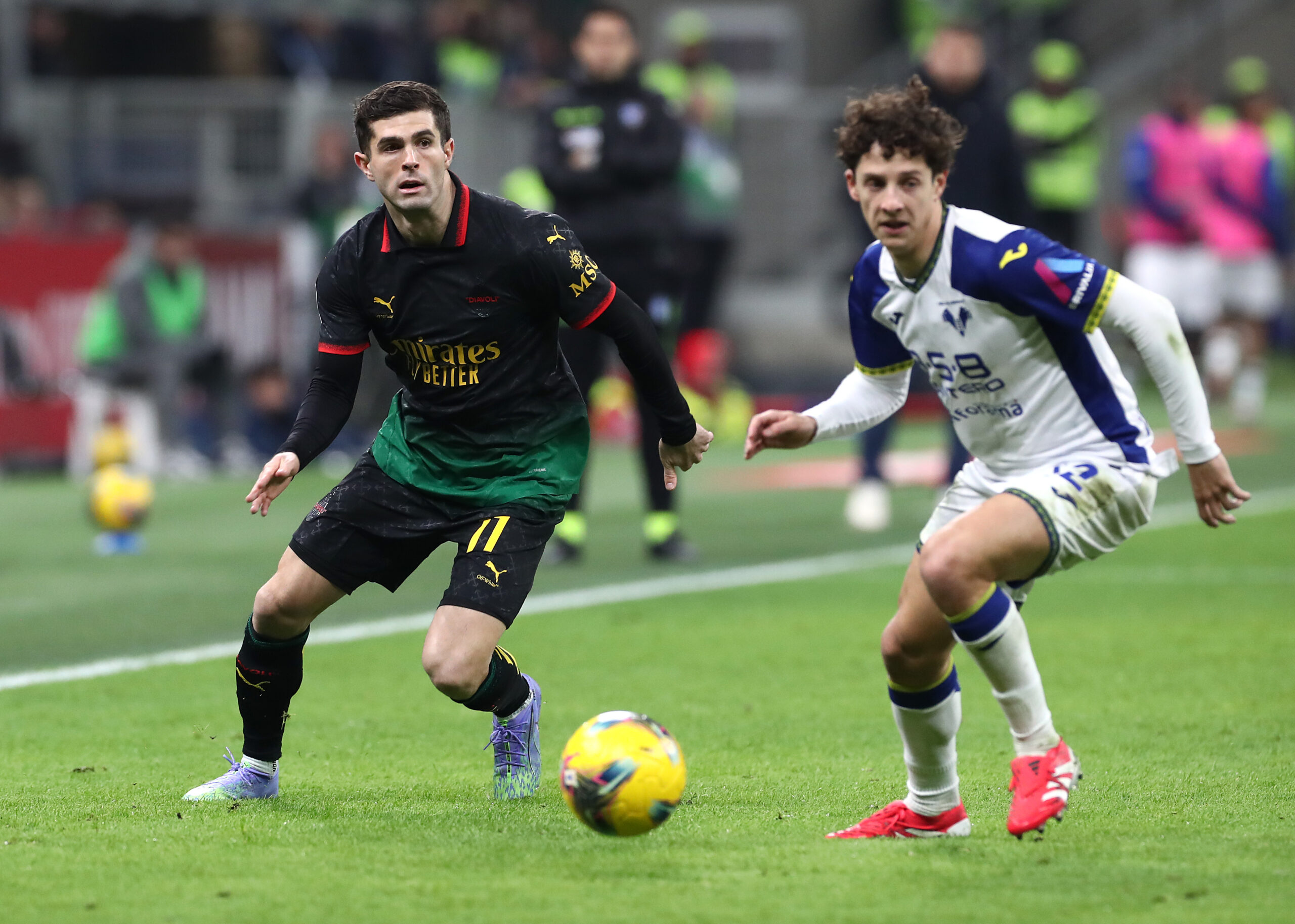 MILAN, ITALY - FEBRUARY 15: Christian Pulisic of AC Milan and Domagoj Bradaric of Hellas Verona battle for the ball during the Serie A match between AC Milan and Verona at Stadio Giuseppe Meazza on February 15, 2025 in Milan, Italy. (Photo by Marco Luzzani/Getty Images)