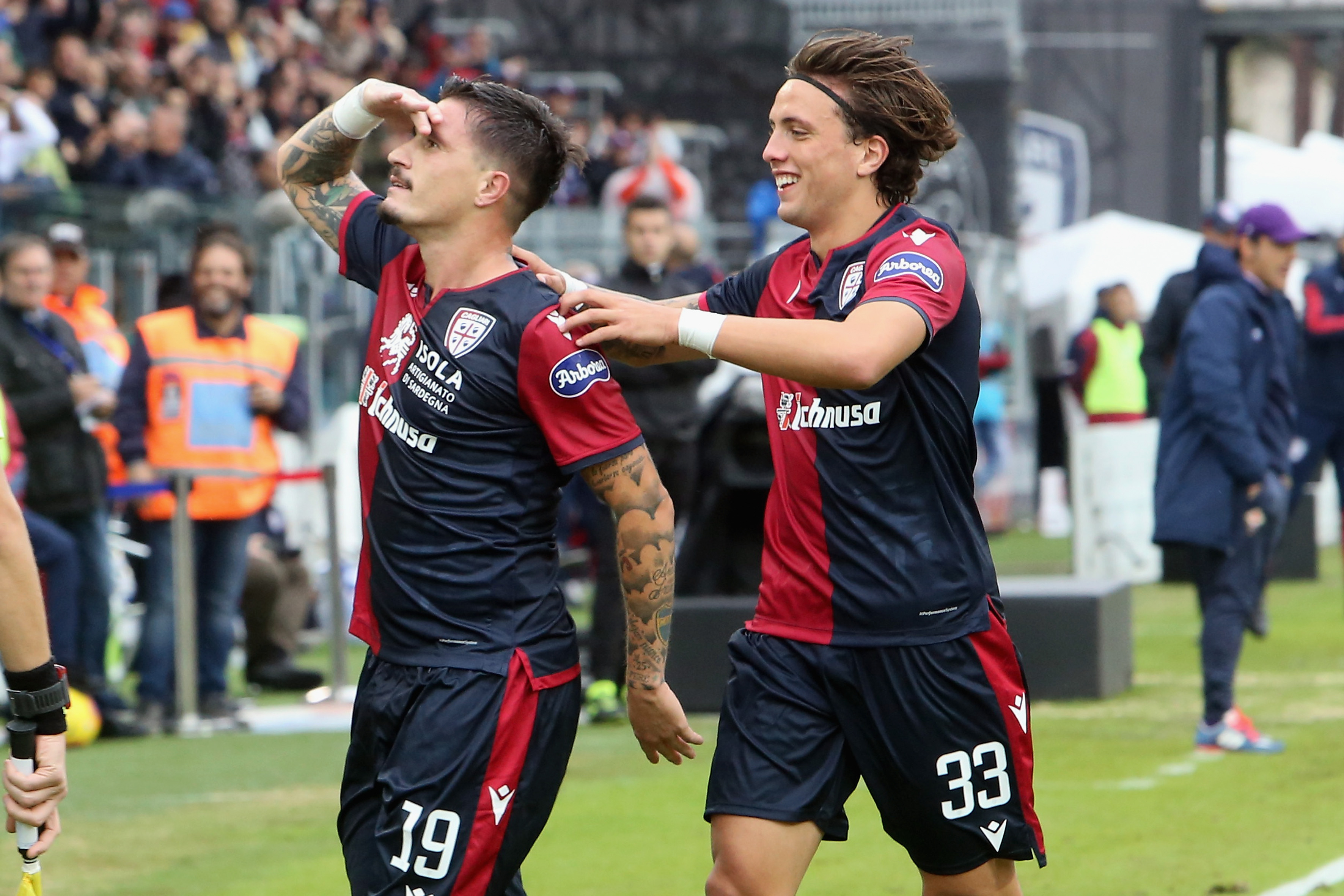 Fabio Pisacane, difensore centrale del Cagliari, abbracciato dal compagno Luca Pellegrini.