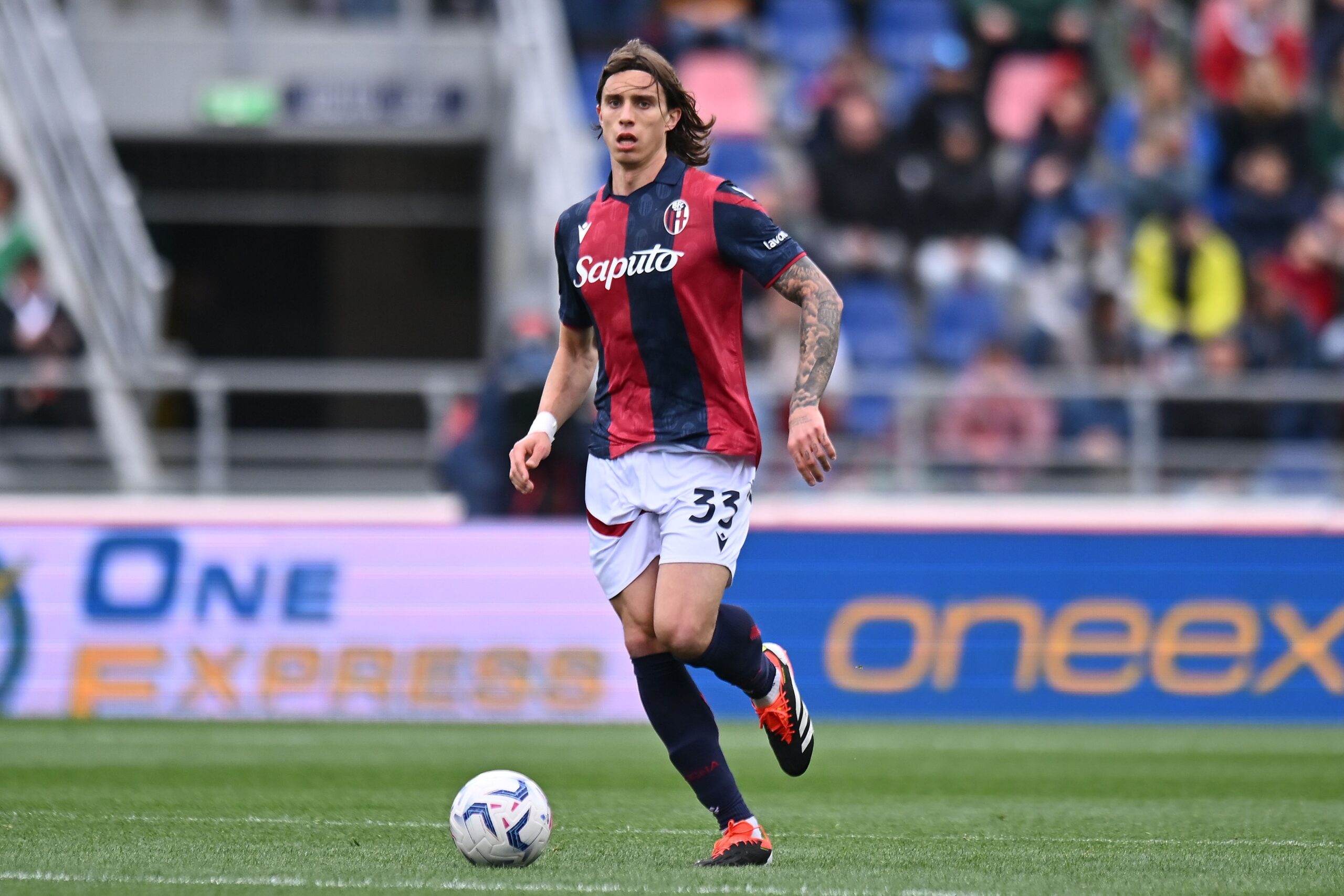 BOLOGNA, ITALY - APRIL 01: Riccardo Calafiori of Bologna FC in action during the Serie A TIM match between Bologna FC and US Salernitana at Stadio Renato Dall'Ara on April 01, 2024 in Bologna, Italy. (Photo by Alessandro Sabattini/Getty Images)