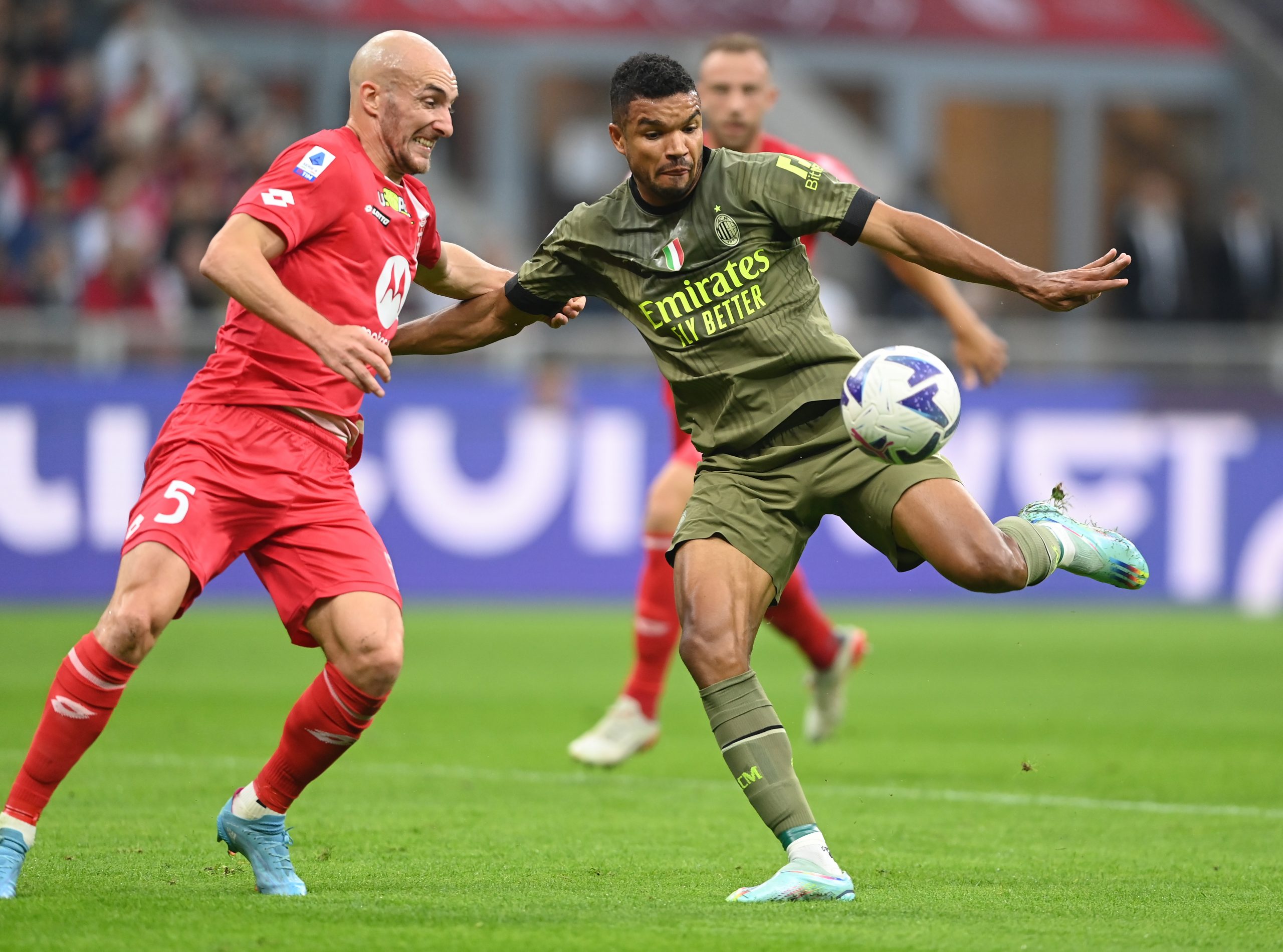 MILAN, ITALY - OCTOBER 22: Junior Messias of AC Milan competes for the ball with Luca Caldirola of AC Monza during the Serie A match between AC Milan and AC Monza at Stadio Giuseppe Meazza on October 22, 2022 in Milan, Italy. (Photo by Claudio Villa/AC Milan via Getty Images)