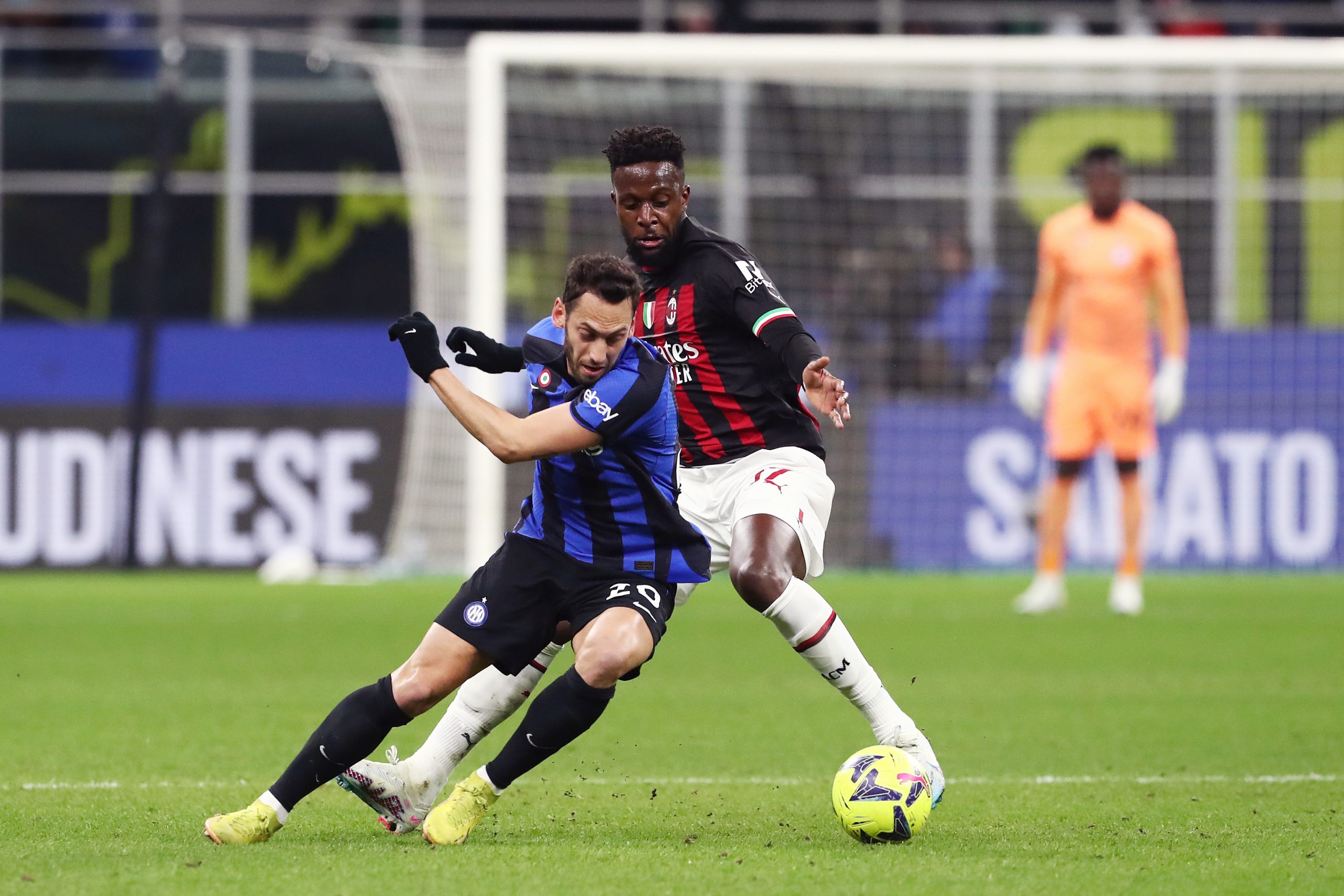 MILAN, ITALY - FEBRUARY 05: Hakan Calhanoglu of FC Internazionale battles for possession with Divock Origi of AC Milan during the Serie A match between FC Internazionale and AC MIlan at Stadio Giuseppe Meazza on February 05, 2023 in Milan, Italy. (Photo by Marco Luzzani/Getty Images)
