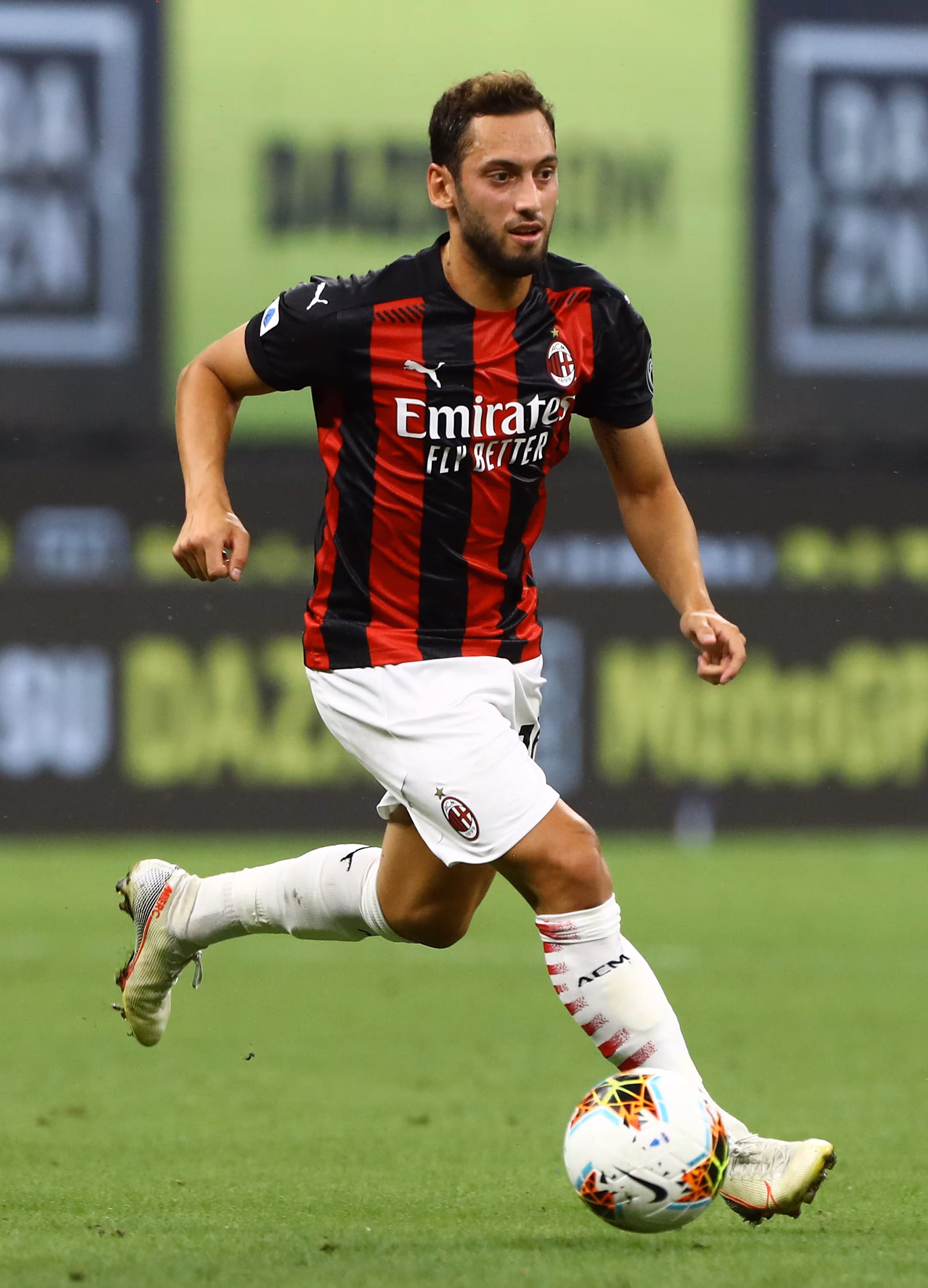 MILAN, ITALY - AUGUST 01: Hakan Calhanoglu of AC Milan in action during the Serie A match between AC Milan and Cagliari Calcio at Stadio Giuseppe Meazza on August 01, 2020 in Milan, Italy. (Photo by Marco Luzzani/Getty Images)
