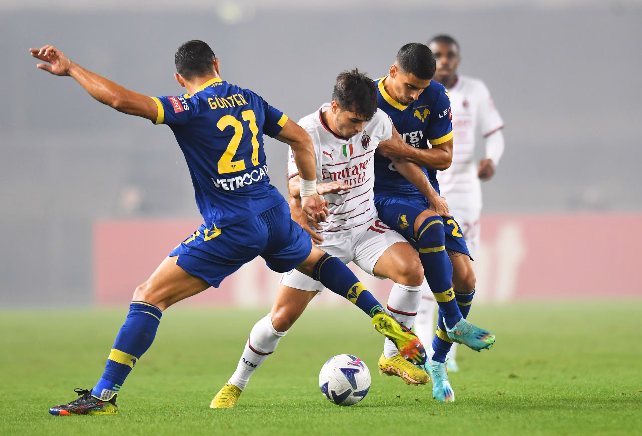VERONA, ITALY - OCTOBER 16: Brahim Diaz of AC Milan battles for possession with Koray Gunter and Fabio Depaoli of Hellas Verona during the Serie A match between Hellas Verona and AC MIlan at Stadio Marcantonio Bentegodi on October 16, 2022 in Verona, Italy. (Photo by Alessandro Sabattini/Getty Images)