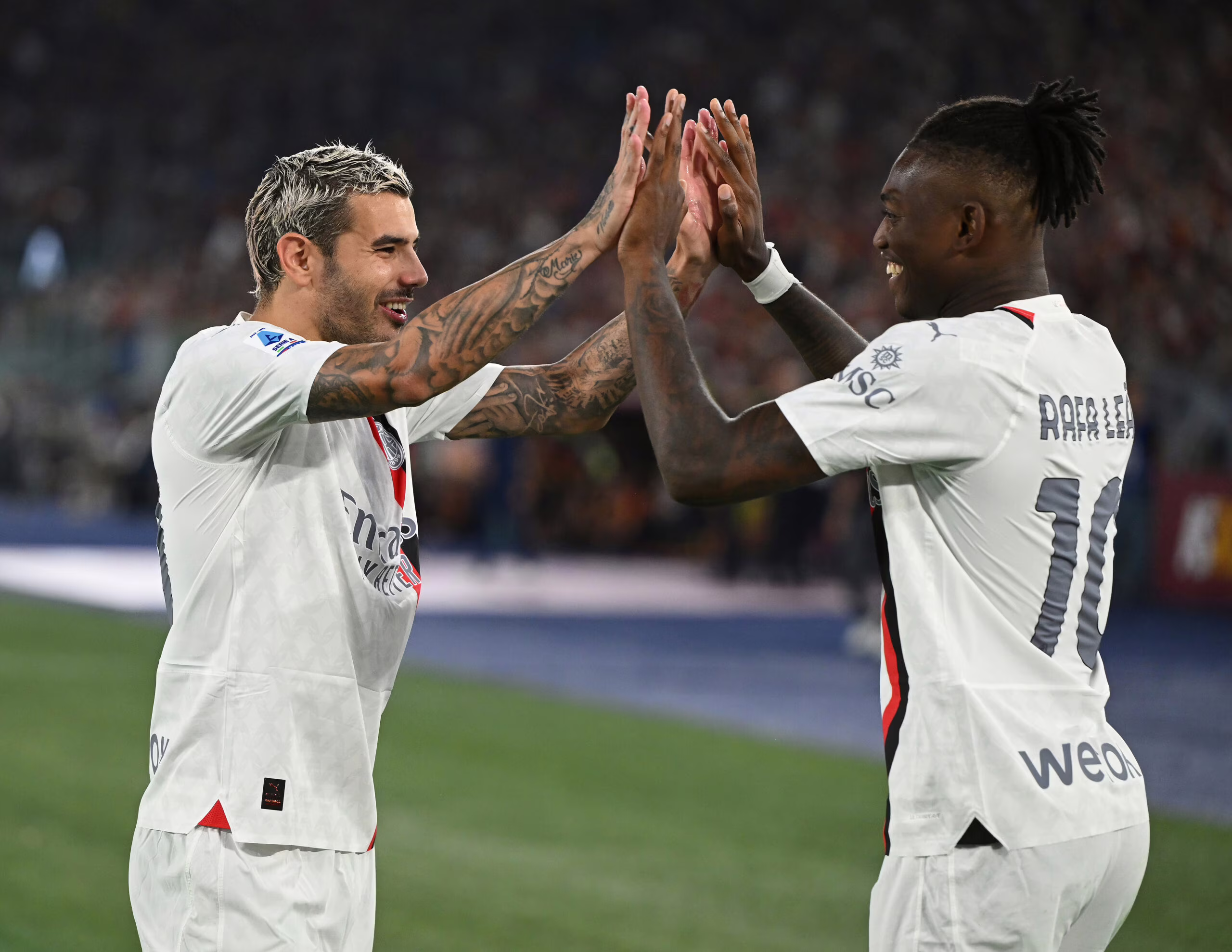 ROME, ITALY - SEPTEMBER 01: Rafael Leao of AC Milan celebrates with Theo Hernandez after scoring the goal during the Serie A TIM match between AS Roma and AC Milan at Stadio Olimpico on September 01, 2023 in Rome, Italy. (Photo by Claudio Villa/AC Milan via Getty Images)