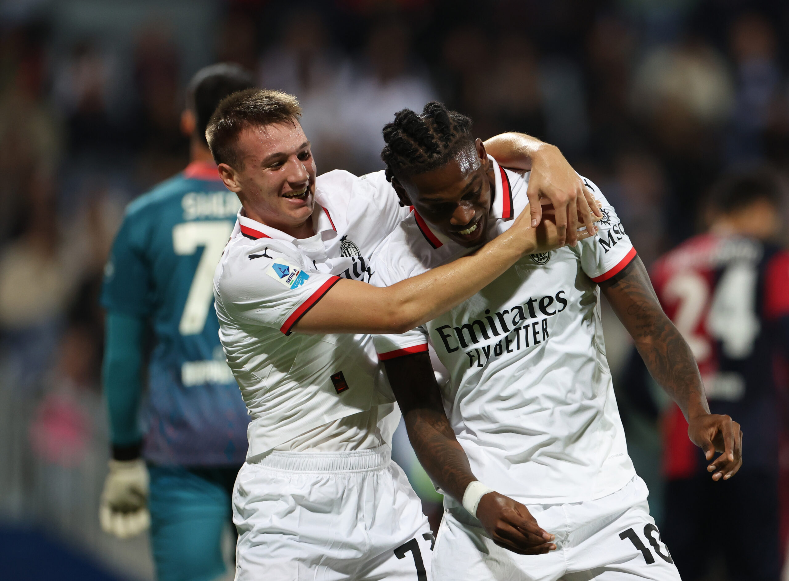 CAGLIARI, ITALY - NOVEMBER 09: Rafael Leao of AC Milan celebrates with Francesco Camarda after scoring the goal during the Serie A match between Cagliari and Milan at Sardegna Arena on November 09, 2024 in Cagliari, Italy. (Photo by Claudio Villa/AC Milan via Getty Images)