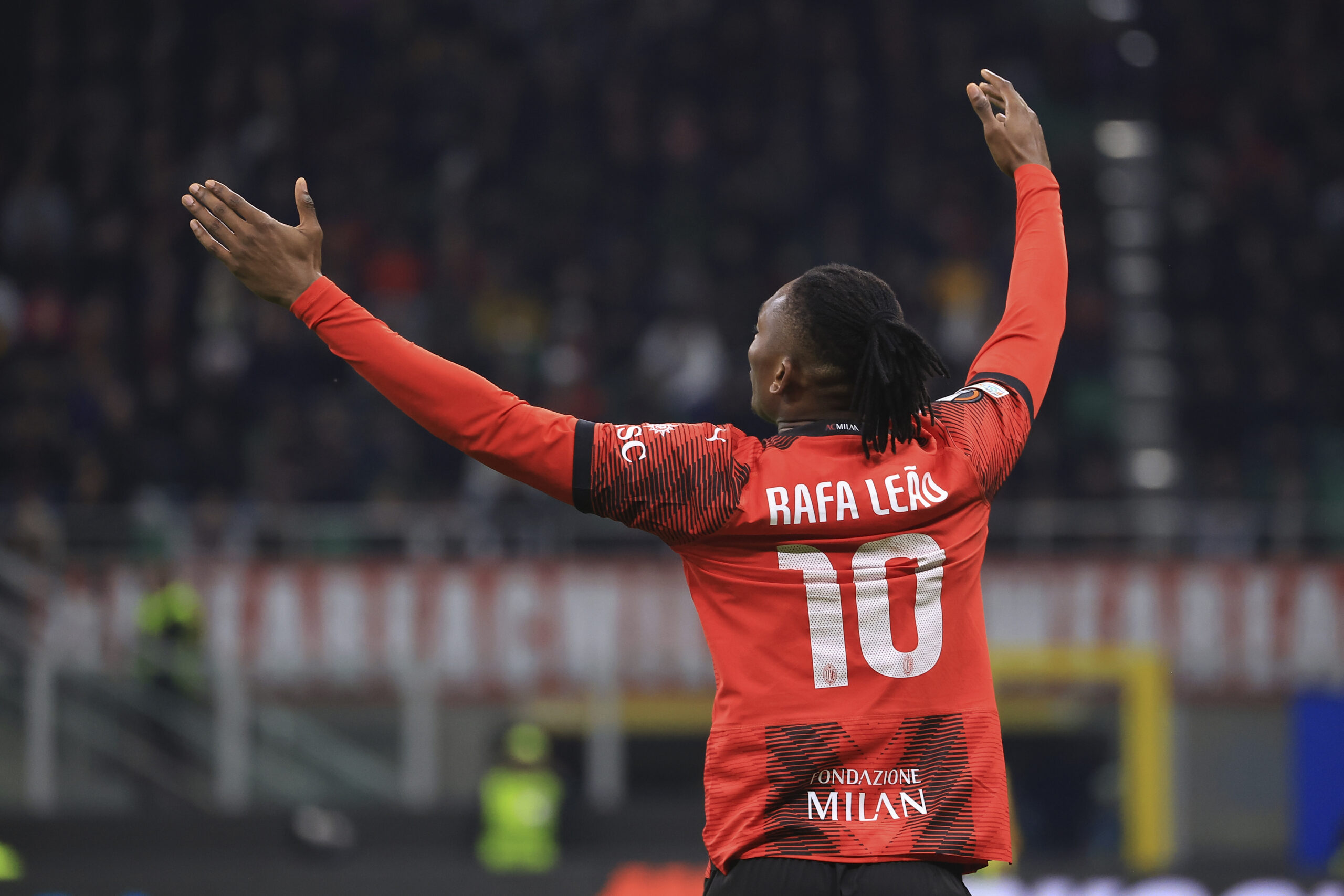 MILAN, ITALY - MARCH 07: Rafael Leao of AC Milan shows his dejection during the UEFA Europa League 2023/24 round of 16 first leg match between AC Milan and Slavia Praha at Stadio Giuseppe Meazza on March 07, 2024 in Milan, Italy. (Photo by Giuseppe Cottini/AC Milan via Getty Images)