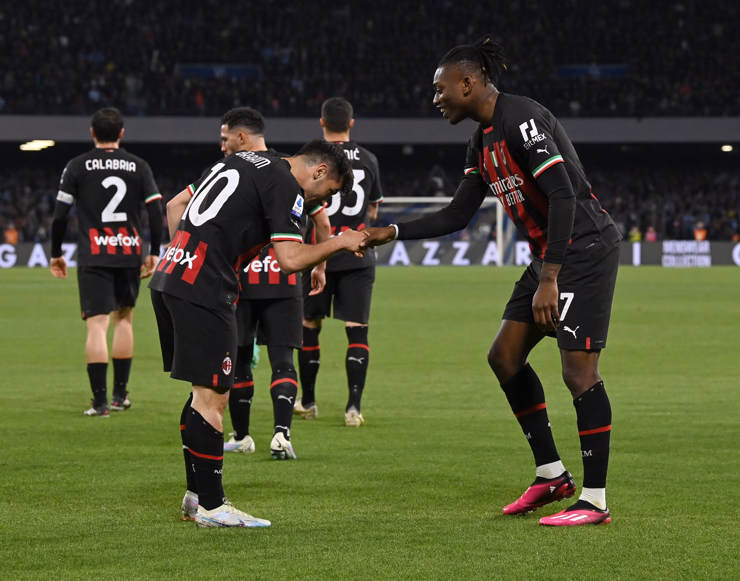 NAPLES, ITALY - APRIL 02: Rafael Leao of AC Milan celebrates after scoring the opening goal during the Serie A match between SSC Napoli and AC Milan at Stadio Diego Armando Maradona on April 02, 2023 in Naples, Italy. (Photo by Claudio Villa/AC Milan via Getty Images)
