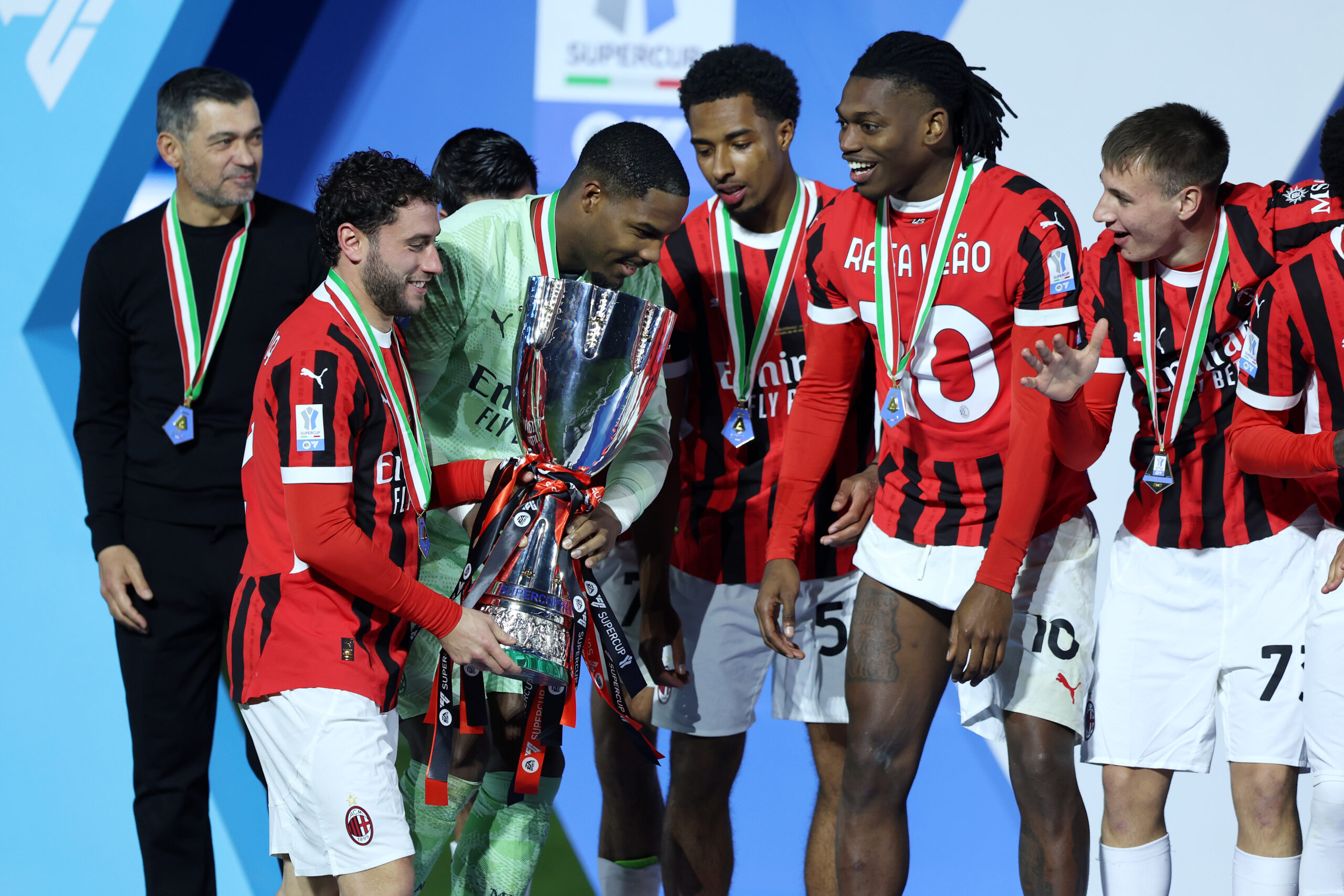 RIYADH, SAUDI ARABIA - JANUARY 06: Davide Calabria and Mike Maignan of AC Milan prepare to lift the Italian Super Cup Trophy after the team's victory in the Italian Super Cup Final between FC Internazionale and AC Milan at Kingdom Arena on January 06, 2025 in Riyadh, Saudi Arabia. (Photo by Yasser Bakhsh/Getty Images)
