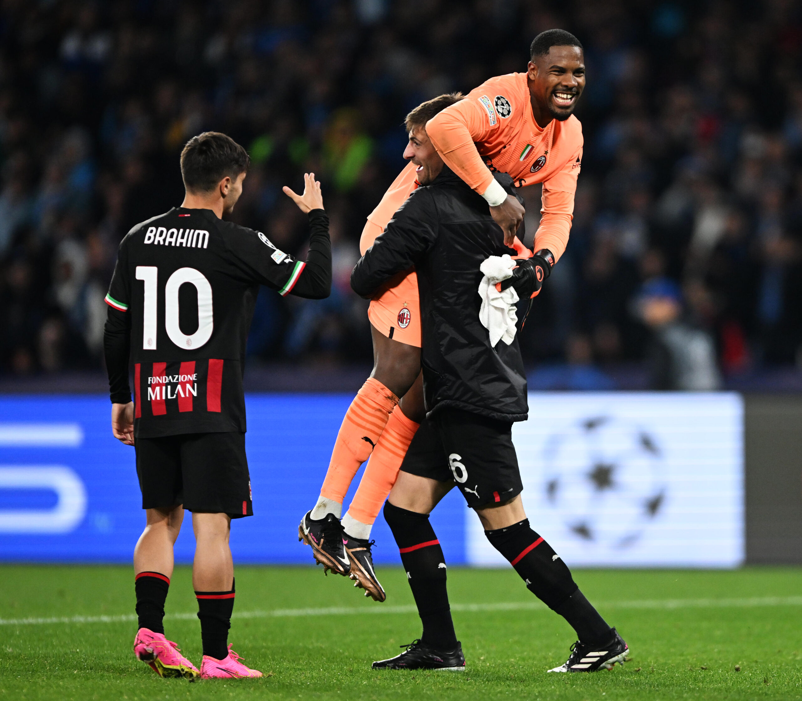 NAPLES, ITALY - APRIL 18: Matteo Gabbia of AC Milan celebrates victory with teammate Mike Maignan of AC Milan after defeating SSC Napoli during the UEFA Champions League Quarterfinal Second Leg match between SSC Napoli and AC Milan at Stadio Diego Armando Maradona on April 18, 2023 in Naples, Italy. (Photo by Francesco Pecoraro/Getty Images)