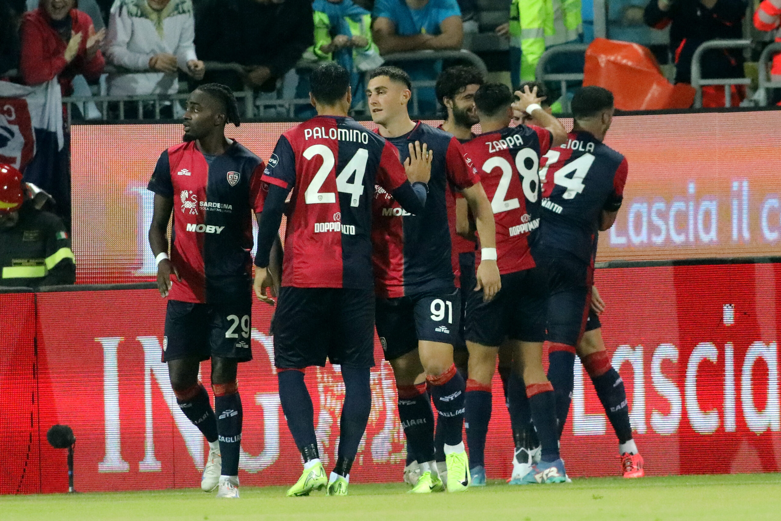 CAGLIARI, ITALY - NOVEMBER 09: Nadir Zortea of Cagliari celebretes his goal 1-0 with the team-mates during the Serie A match between Cagliari and AC Milan at Sardegna Arena on November 09, 2024 in Cagliari, Italy. (Photo by Enrico Locci/Getty Images)