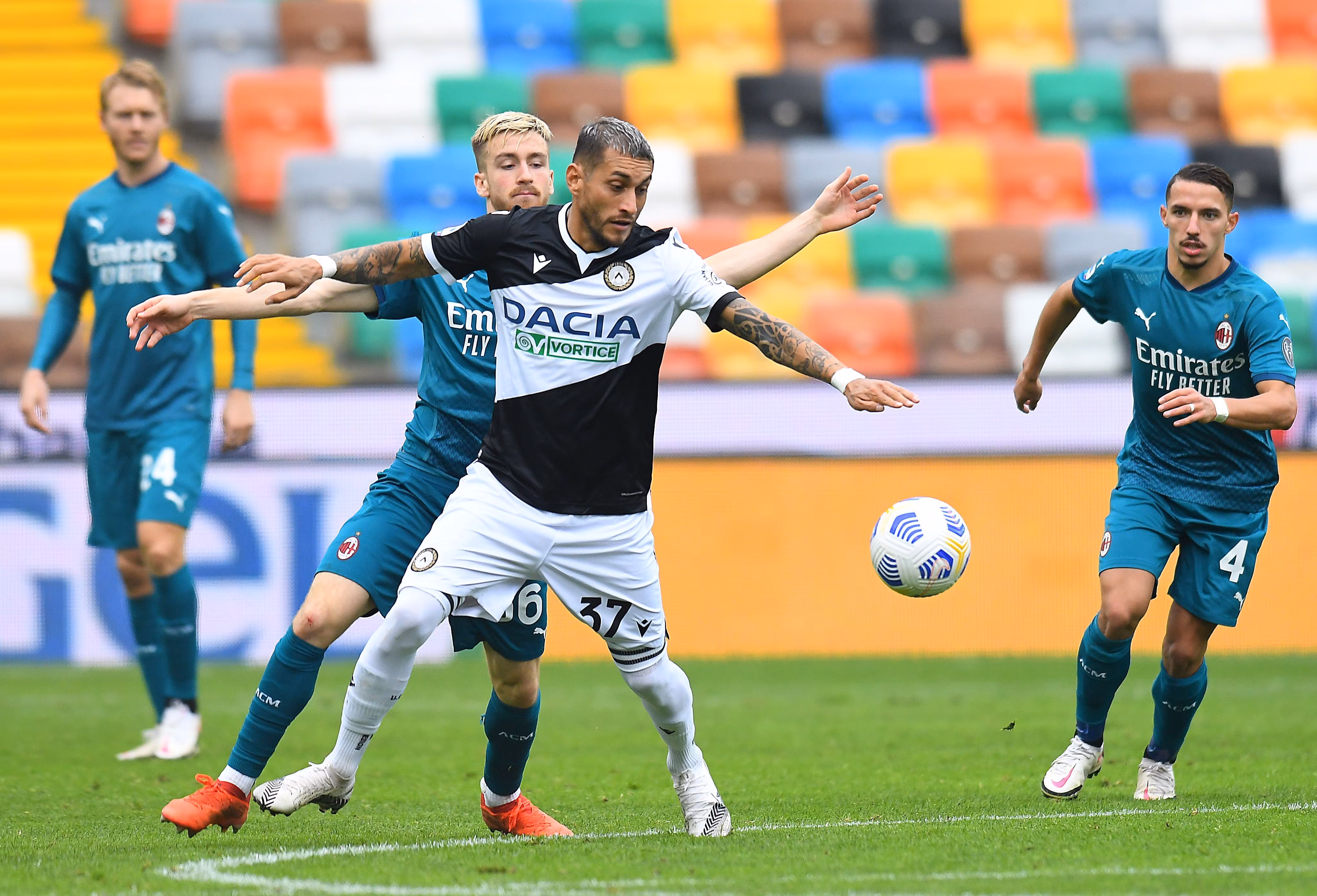 UDINE, ITALY - NOVEMBER 01: Alexis Saelemaekers of AC Milan competes for the ball with Roberto Pereyra of Udinese Calcio during the Serie A match between Udinese Calcio and AC Milan at Dacia Arena on November 01, 2020 in Udine, Italy. (Photo by Alessandro Sabattini/Getty Images)