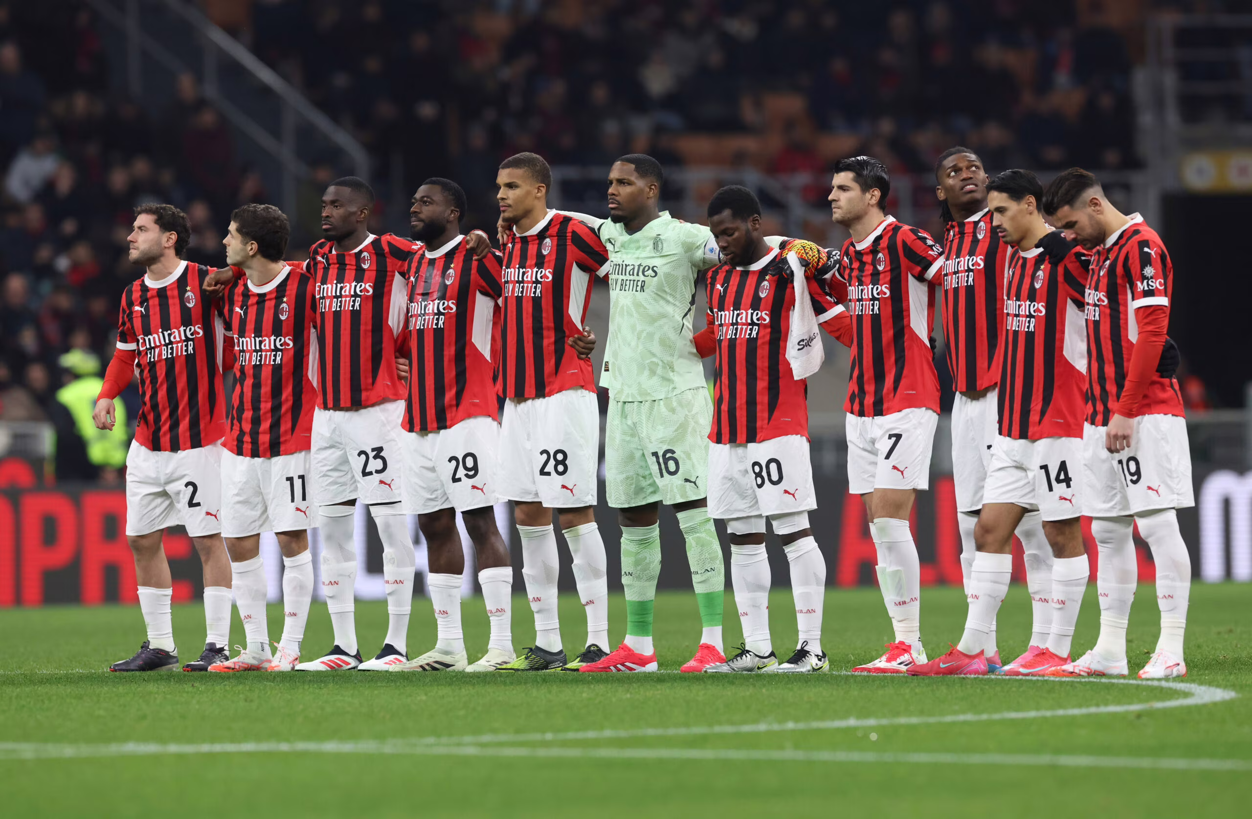 MILAN, ITALY - JANUARY 11: Players of AC Milan observe a minute of silence before the Serie A match between AC Milan and Cagliari at Stadio Giuseppe Meazza on January 11, 2025 in Milan, Italy. (Photo by Claudio Villa/AC Milan via Getty Images)
