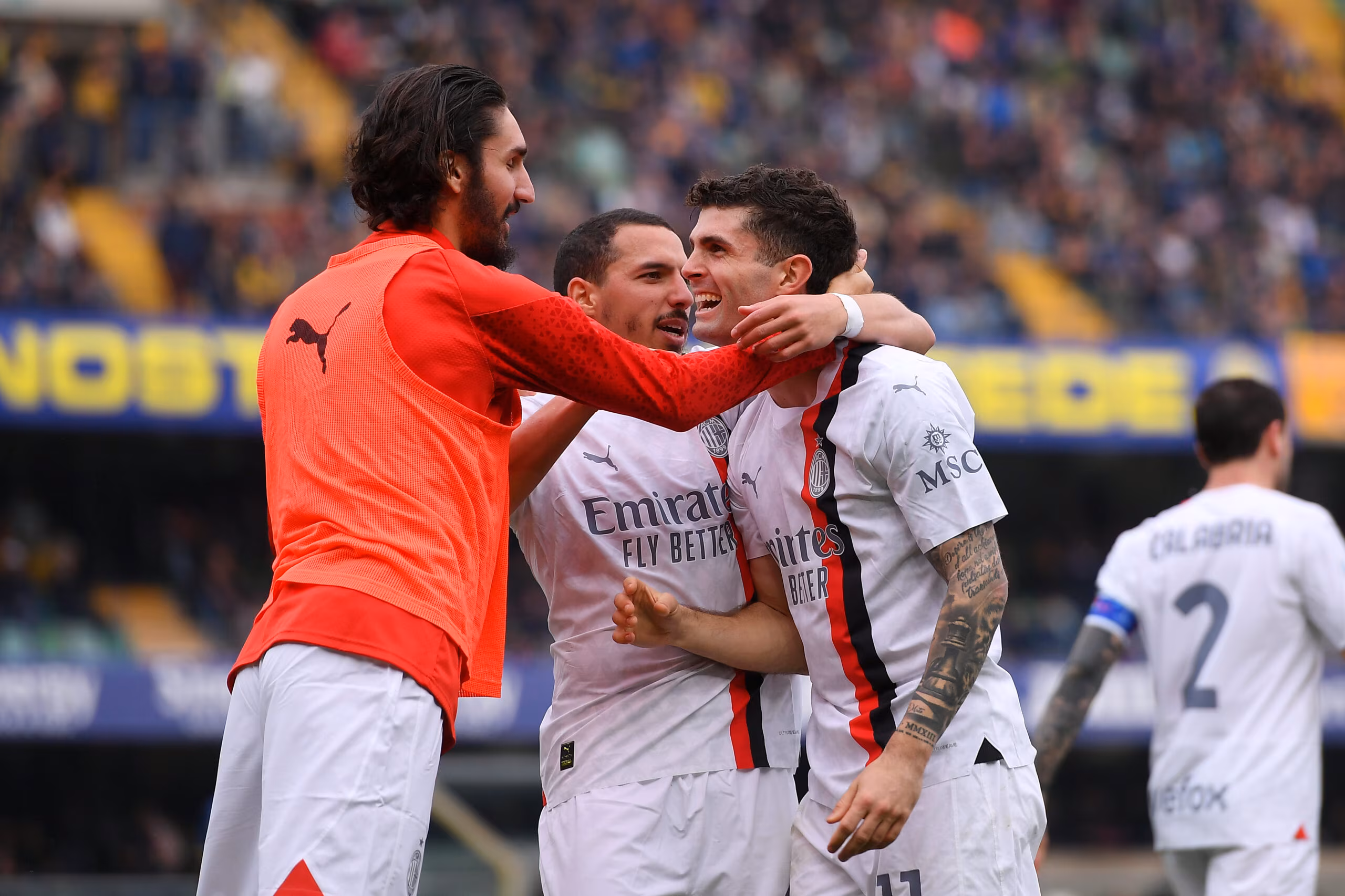 VERONA, ITALY - MARCH 17: Christian Pulisic of AC Milan celebrates scoring his team's second goal with teammates Noah Okafor and Yacine Adli of AC Milan during the Serie A TIM match between Hellas Verona FC and AC Milan at Stadio Marcantonio Bentegodi on March 17, 2024 in Verona, Italy. (Photo by Alessandro Sabattini/Getty Images)