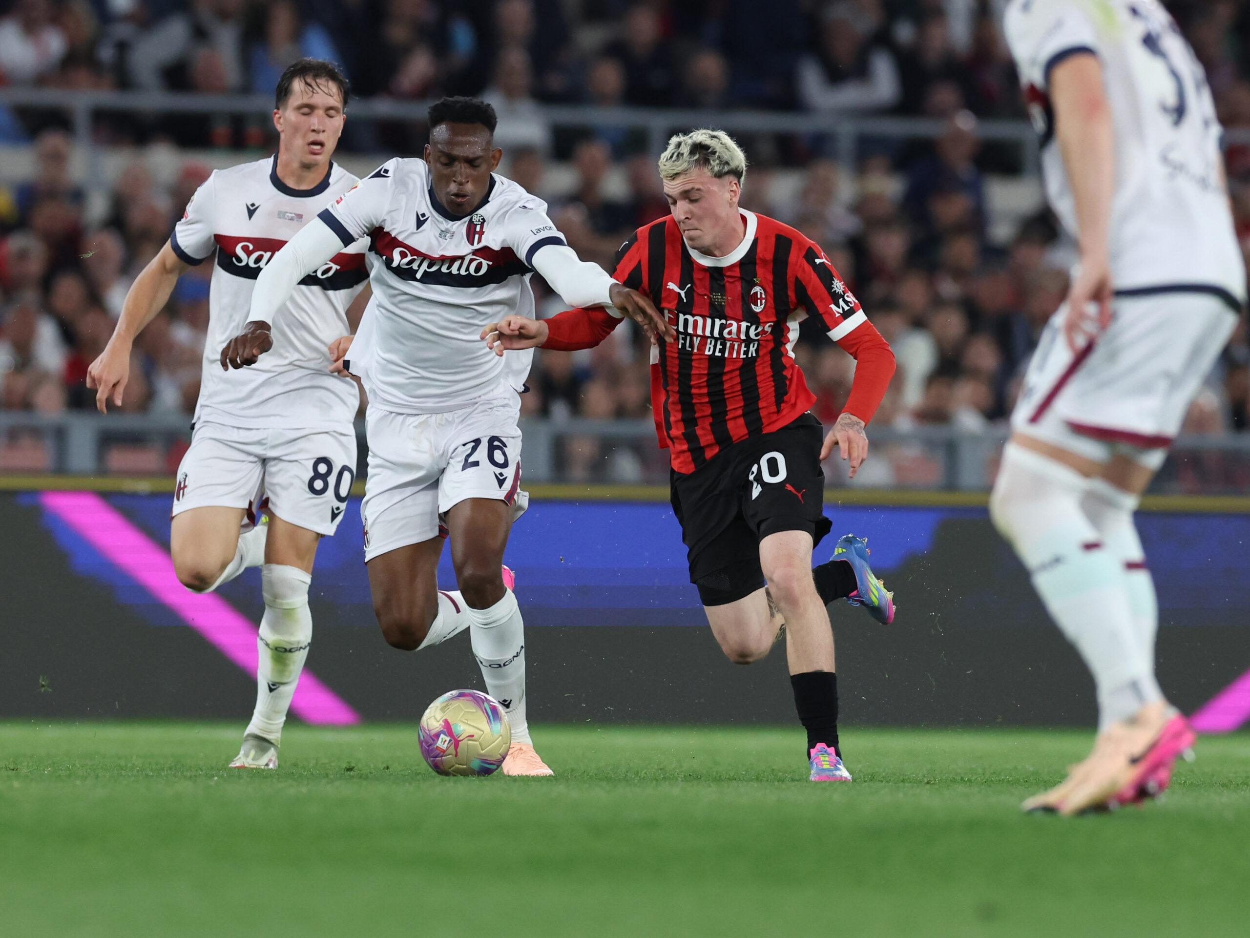 ROME, ITALY - MAY 14: Alejandro Jimenez of AC Milan in action during the Coppa Italia Final match between AC Milan and Bologna at Stadio Olimpico on May 14, 2025 in Rome, Italy. (Photo by Claudio Villa/AC Milan via Getty Images)