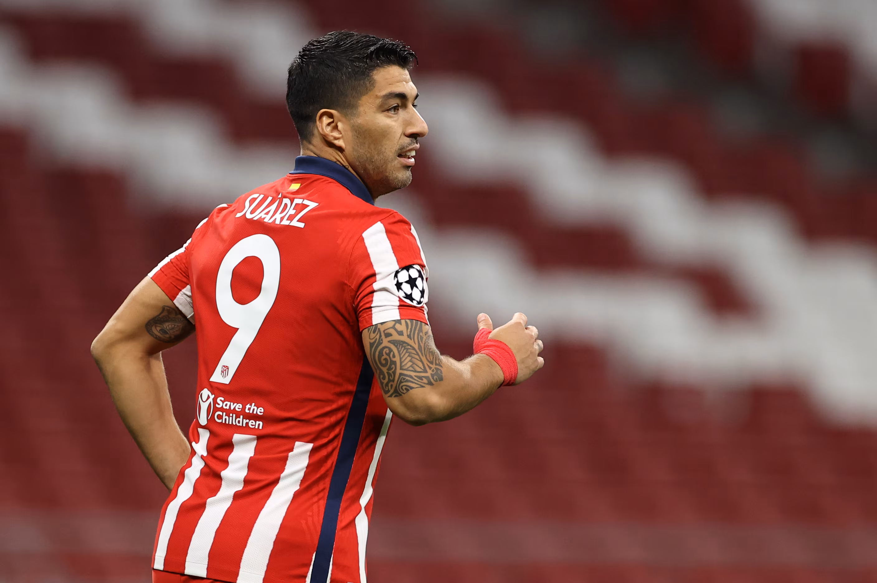 MADRID, SPAIN - OCTOBER 27: Luis Suarez of Atletico de Madrid in action during the UEFA Champions League Group A stage match between Atletico Madrid and RB Salzburg at Estadio Wanda Metropolitano on October 27, 2020 in Madrid, Spain. Football Stadiums around Europe remain empty due to the Coronavirus Pandemic as Government social distancing laws prohibit fans inside venues resulting in fixtures being played behind closed doors. (Photo by Angel Martinez/Getty Images)