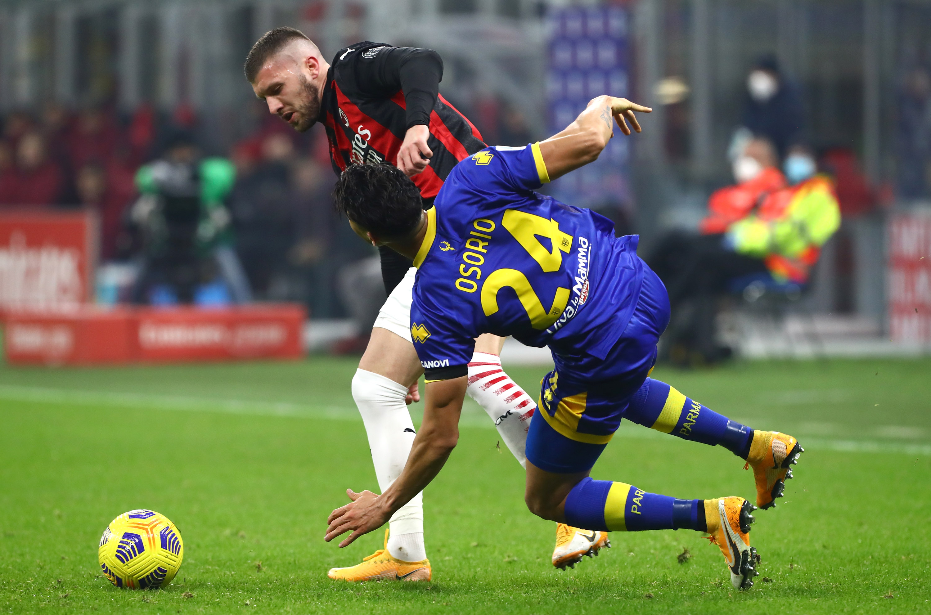 MILAN, ITALY - DECEMBER 13: Ante Rebic of AC Milan competes for the ball with Yordan Osorio of Parma Calcio during the Serie A match between AC Milan and Parma Calcio at Stadio Giuseppe Meazza on December 13, 2020 in Milan, Italy. (Photo by Marco Luzzani/Getty Images)