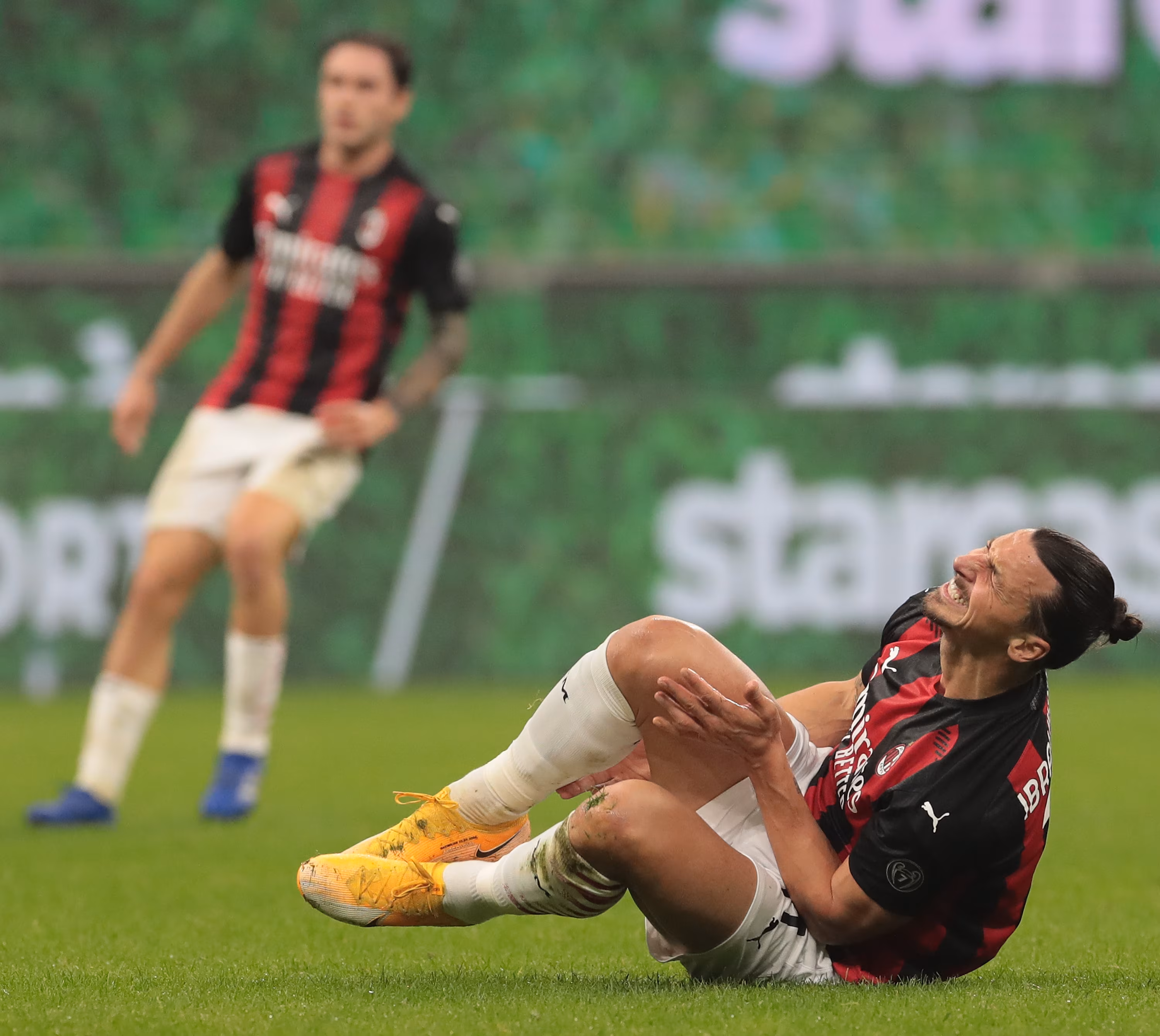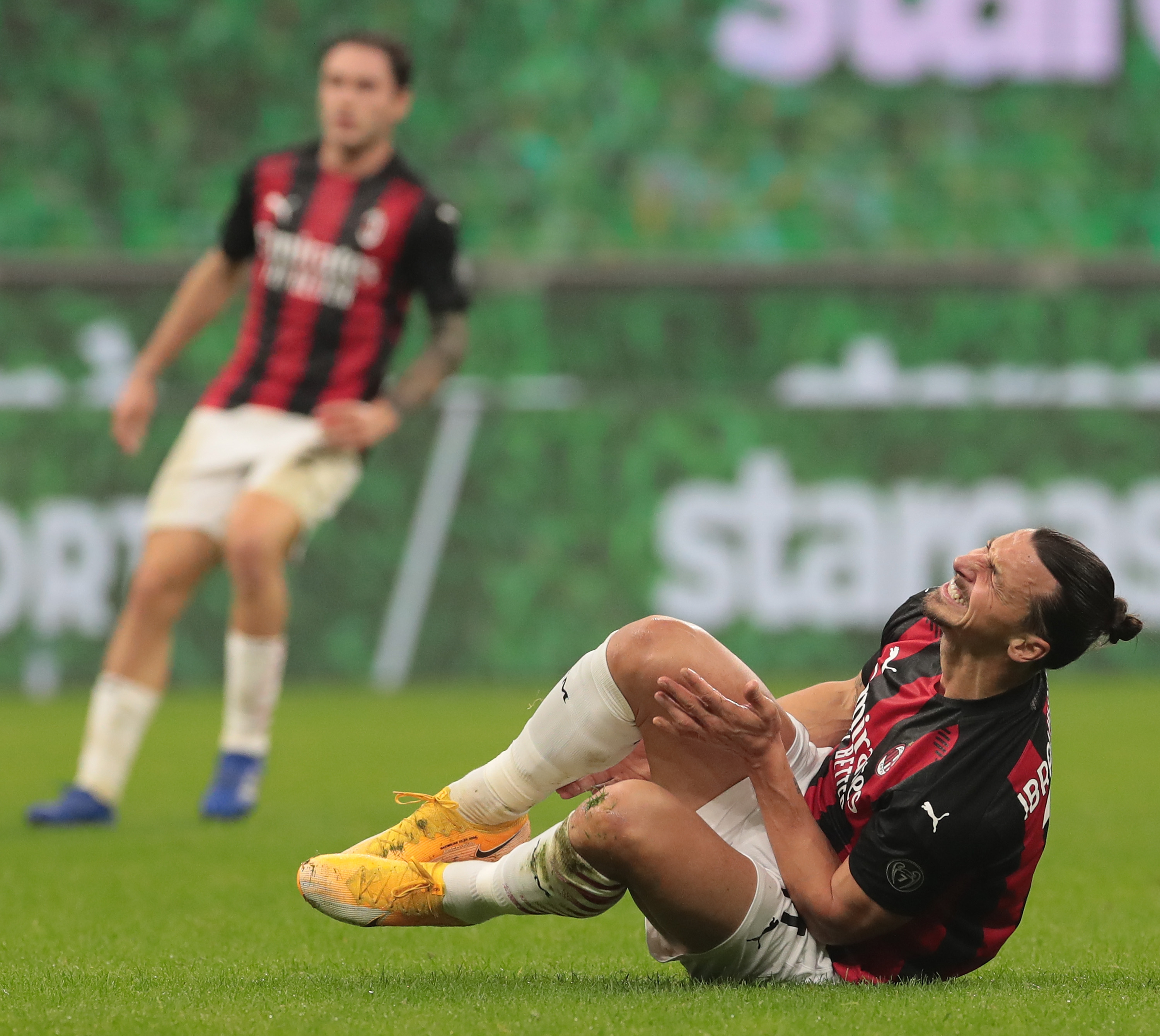 MILAN, ITALY - NOVEMBER 08: Zlatan Ibrahimovic of AC Milan lies injured during the Serie A match between AC Milan and Hellas Verona FC at Stadio Giuseppe Meazza on November 8, 2020 in Milan, Italy. (Photo by Emilio Andreoli/Getty Images)