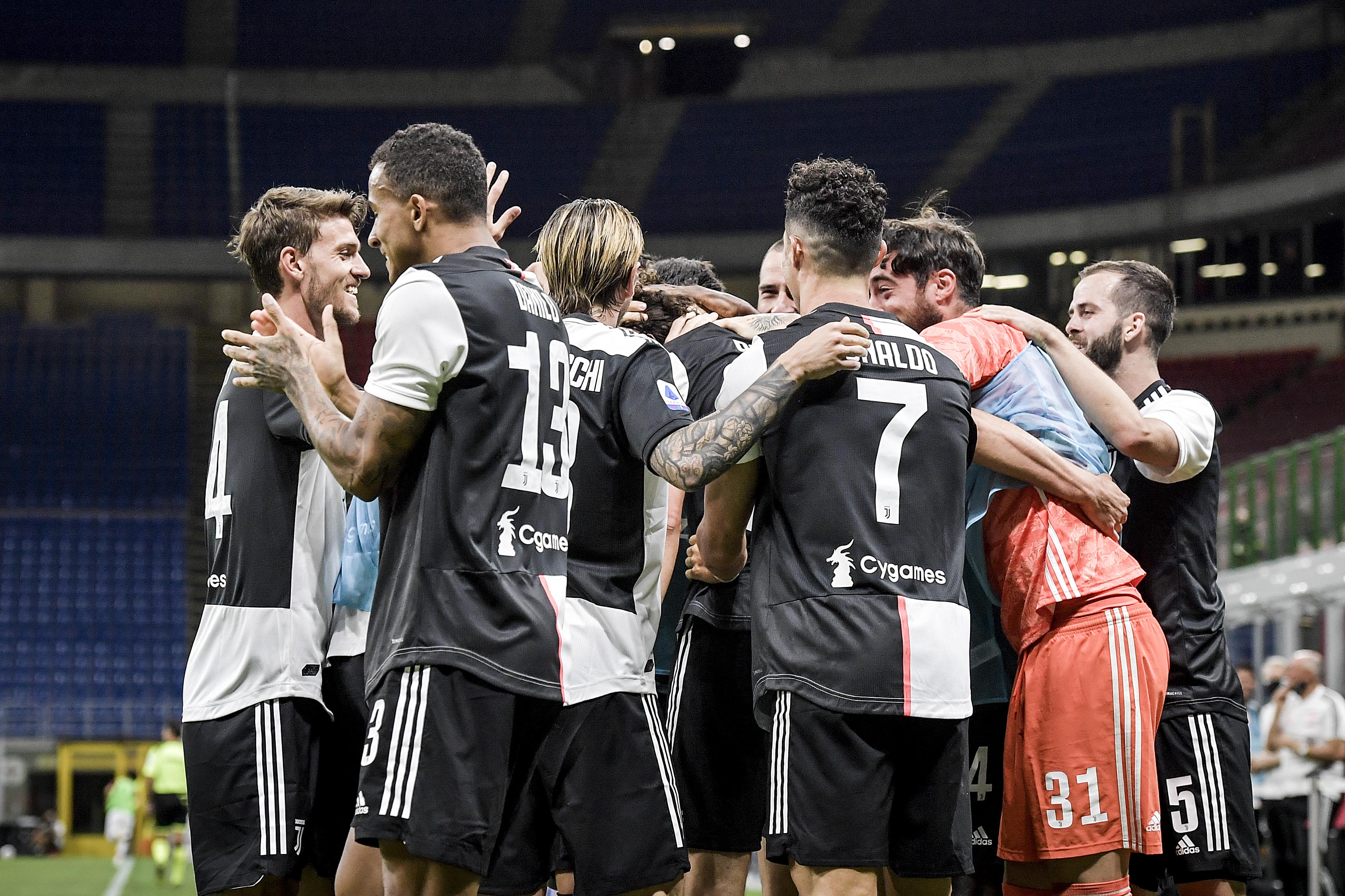 MILAN, ITALY - JULY 07: Juventus player Adrien Rabiot celebrates 0-1 goal during the Serie A match between AC Milan and Juventus at Stadio Giuseppe Meazza on July 07, 2020 in Milan, Italy. (Photo by Daniele Badolato - Juventus FC/Juventus FC via Getty Images)