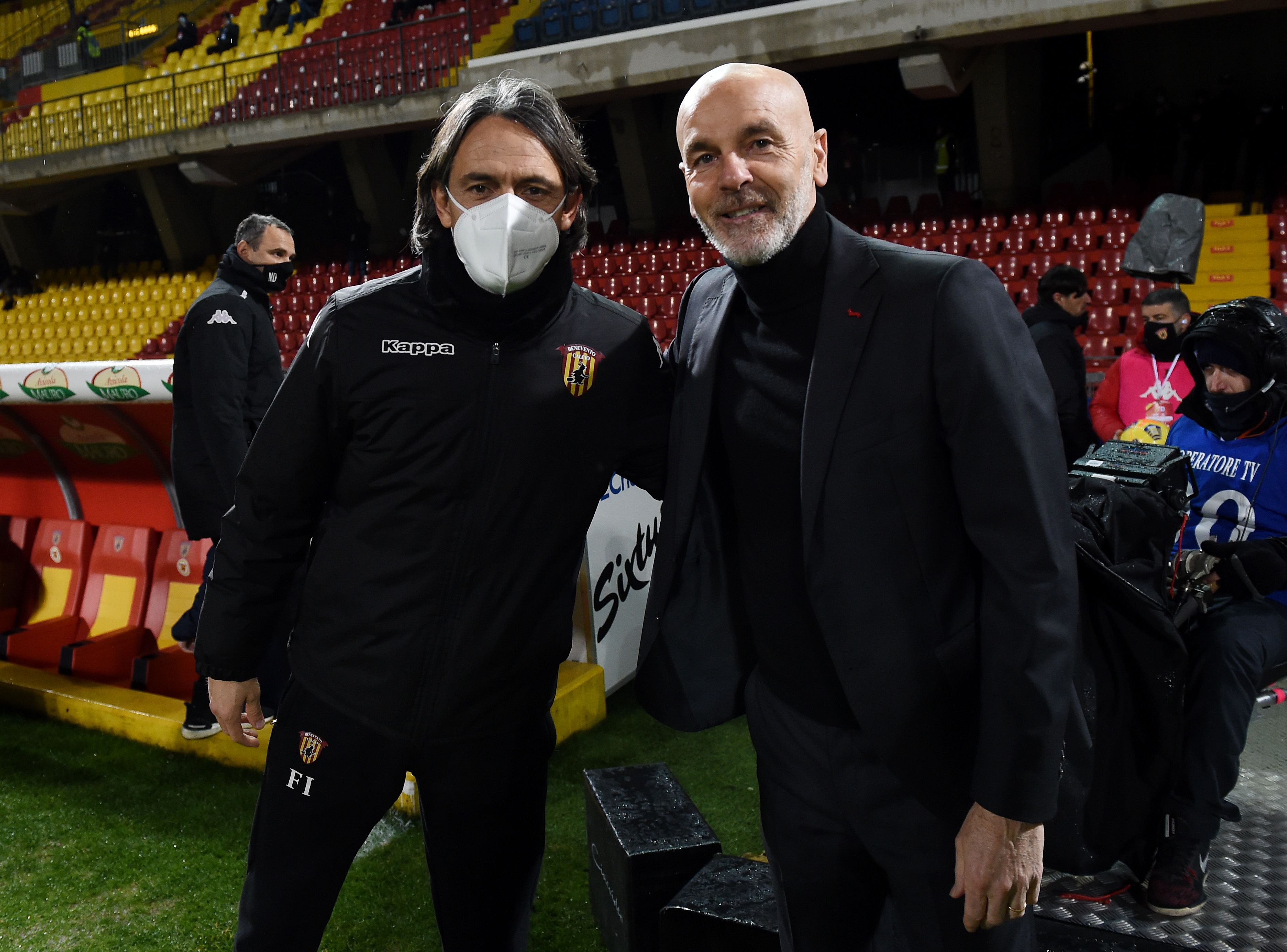 Stefano Pioli, tecnico del Milan, accanto a Pippo Inzaghi, allenatore del Benevento