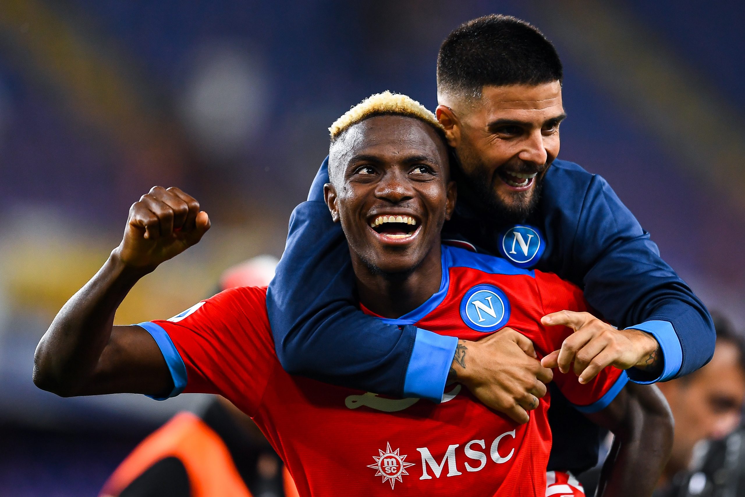 Oshimen e Insigne esultano dopo la vittoria del Napoli.