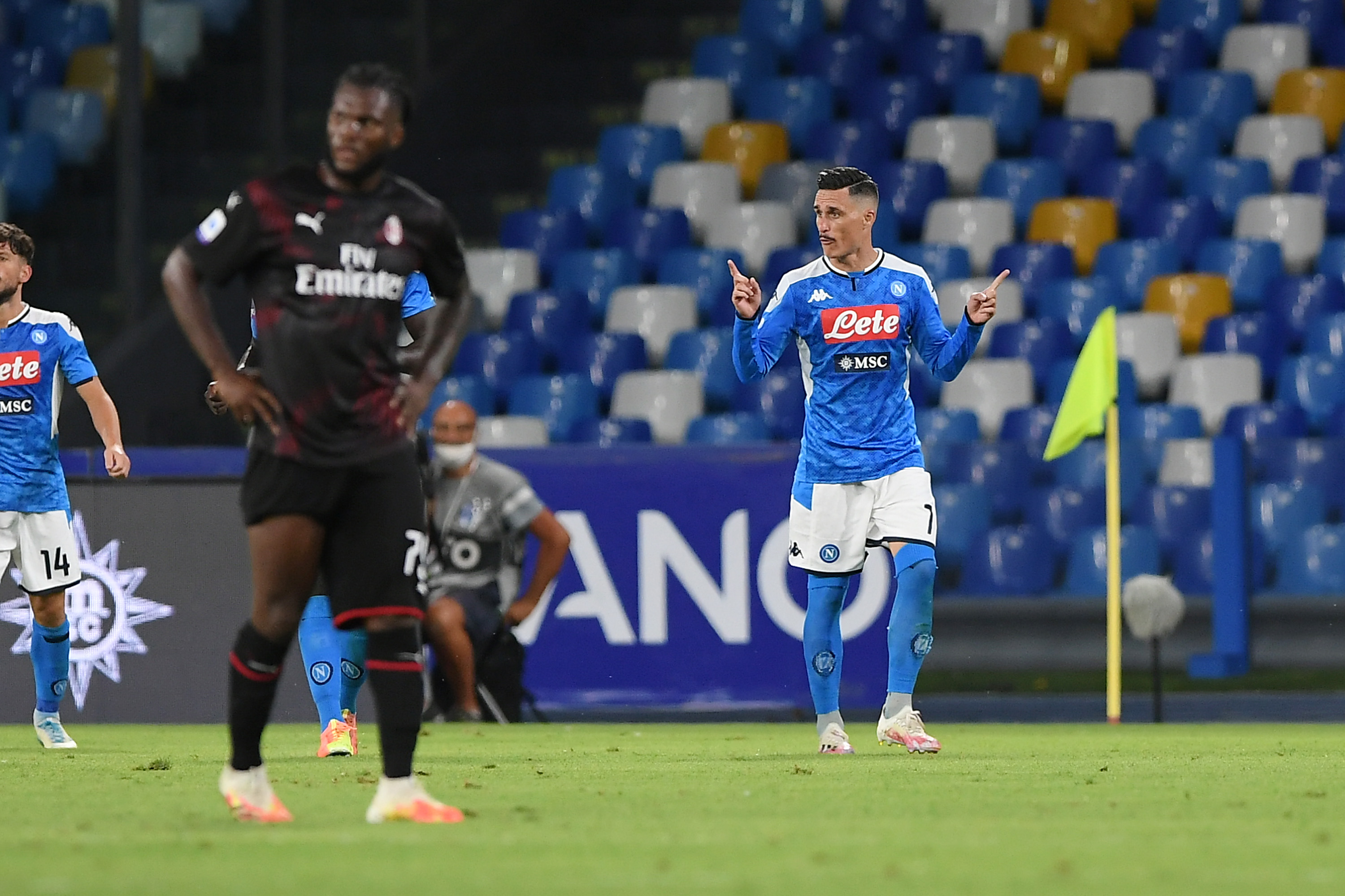 NAPLES, ITALY - JULY 12: Jose Callejon of SSC Napoli celebrates the 2-1 goal scored by Dries Mertens, beside the disappointment of Franck Kessie of AC Milan during the Serie A match between SSC Napoli and AC Milan at Stadio San Paolo on July 12, 2020 in Naples, Italy. (Photo by Francesco Pecoraro/Getty Images)
