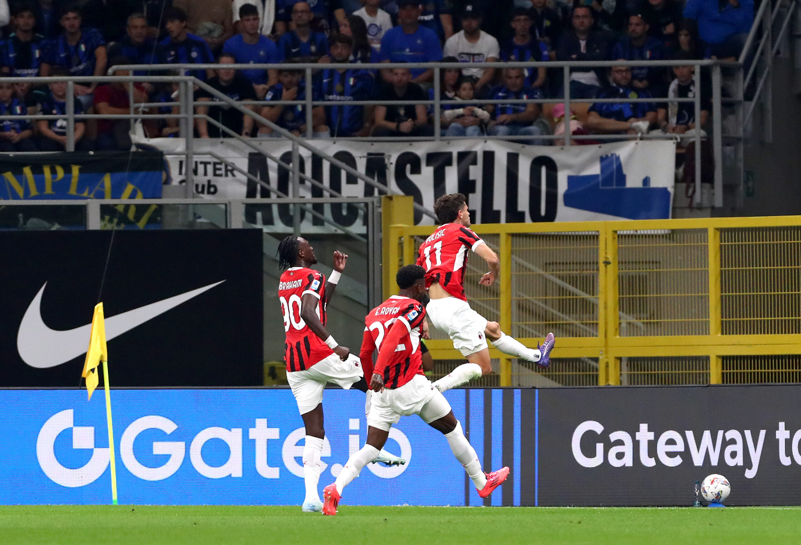 MILAN, ITALY - SEPTEMBER 22: Christian Pulisic of AC Milan celebrates scoring his team's first goal during the Serie A match between FC Internazionale and AC Milan at Stadio Giuseppe Meazza on September 22, 2024 in Milan, Italy. (Photo by Marco Luzzani/Getty Images)