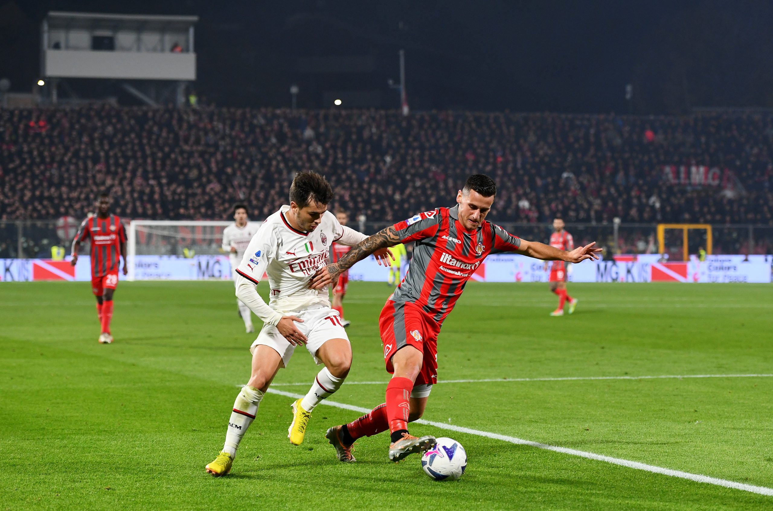 CREMONA, ITALY - NOVEMBER 08: Brahim Diaz of AC Milan and Emanuele Valeri of US Cremonese battle for the ball during the Serie A match between US Cremonese and AC Milan at Stadio Giovanni Zini on November 08, 2022 in Cremona, Italy. (Photo by Alessandro Sabattini/Getty Images)