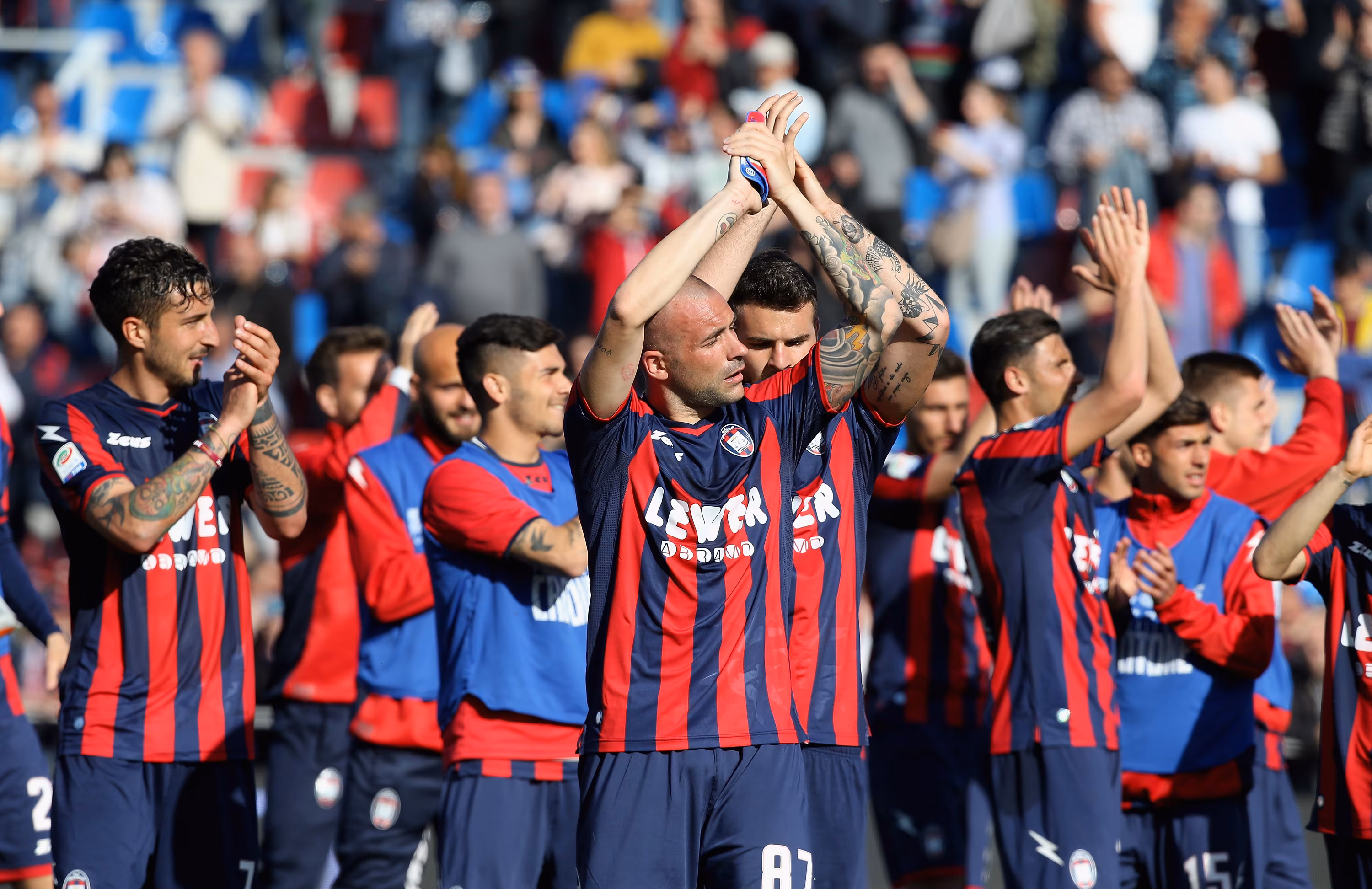 CROTONE, ITALY - APRIL 08: Players of Crotone celebrate after the serie A match between FC Crotone and Bologna FC at Stadio Comunale Ezio Scida on April 8, 2018 in Crotone, Italy. (Photo by Maurizio Lagana/Getty Images)