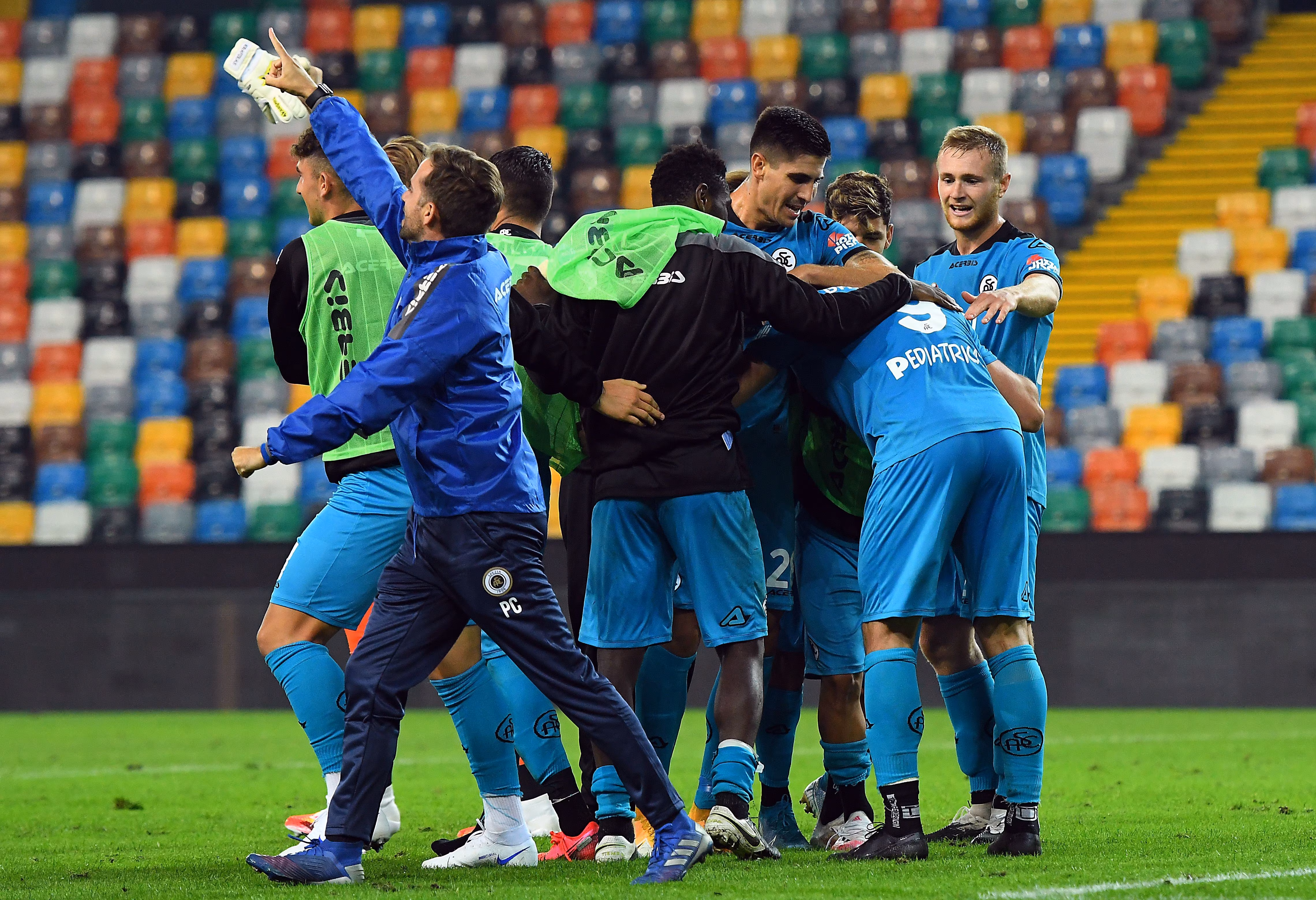 UDINE, ITALY - SEPTEMBER 30: Andrey Galabinov of Spezia Calcio celebrates after scoring his team's second goal with teammates during the Serie A match between Udinese Calcio and Spezia Calcio at Dacia Arena on September 30, 2020 in Udine, Italy. (Photo by Alessandro Sabattini/Getty Images)