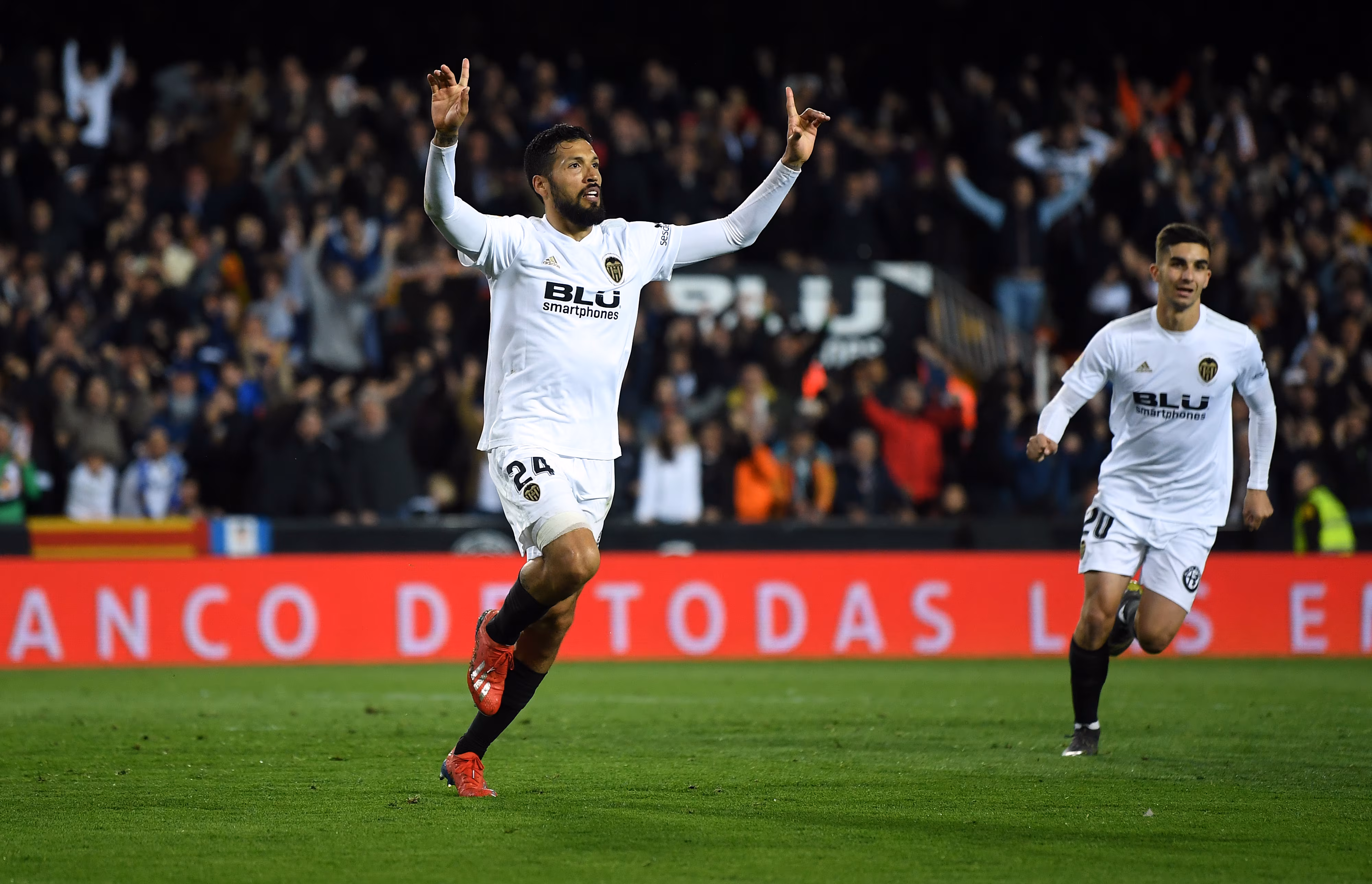 VALENCIA, SPAIN - APRIL 03: Ezequiel Garay of Valencia celebrates scoring his side's second goal during the La Liga match between Valencia CF and Real Madrid CF at Estadio Mestalla on April 03, 2019 in Valencia, Spain. (Photo by David Ramos/Getty Images)