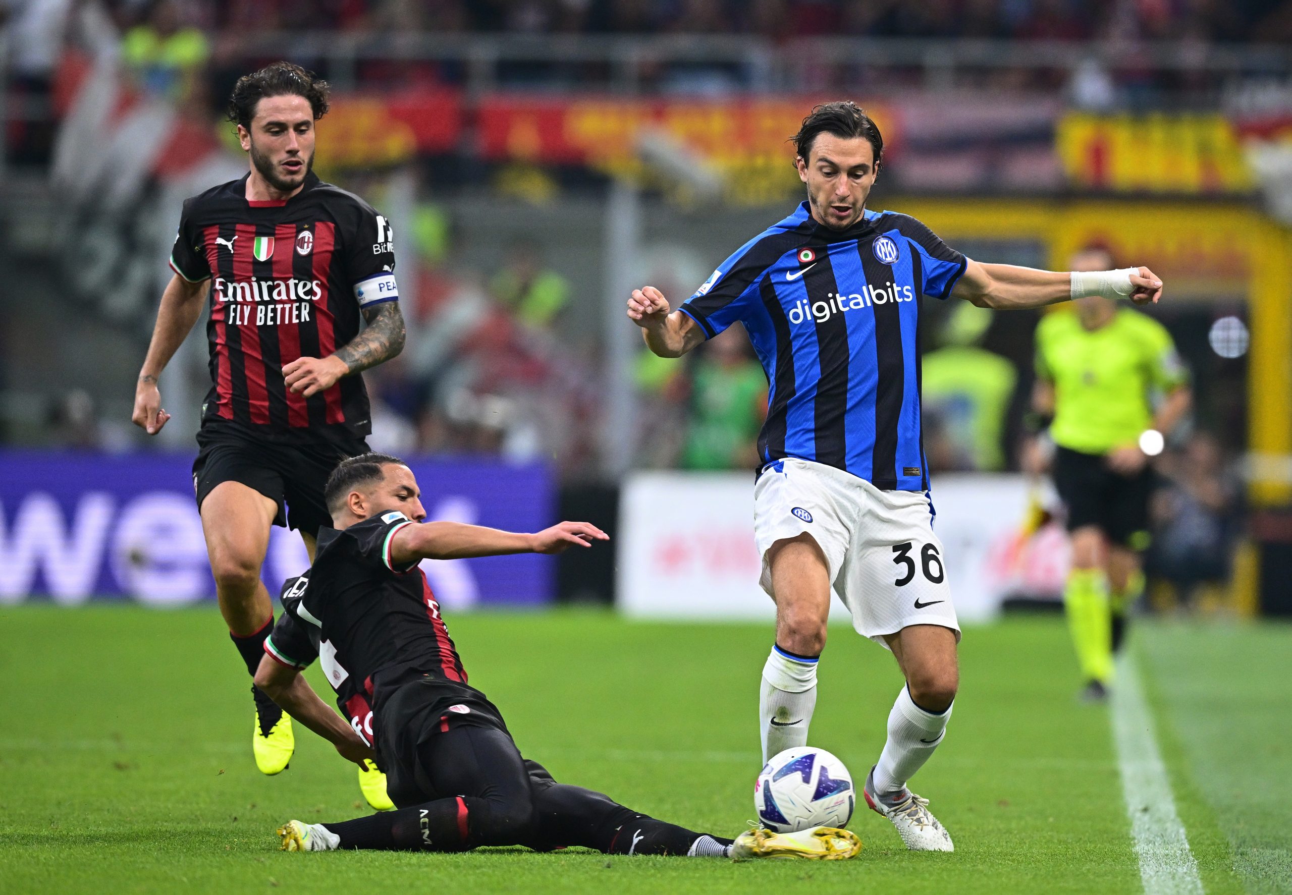 MILAN, ITALY - SEPTEMBER 03: Matteo Darmian of FC Internazionale competes for the ball during the Serie A match between AC Milan and FC Internazionale at Stadio Giuseppe Meazza on September 03, 2022 in Milan, Italy. (Photo by Mattia Ozbot - Inter/Inter via Getty Images)