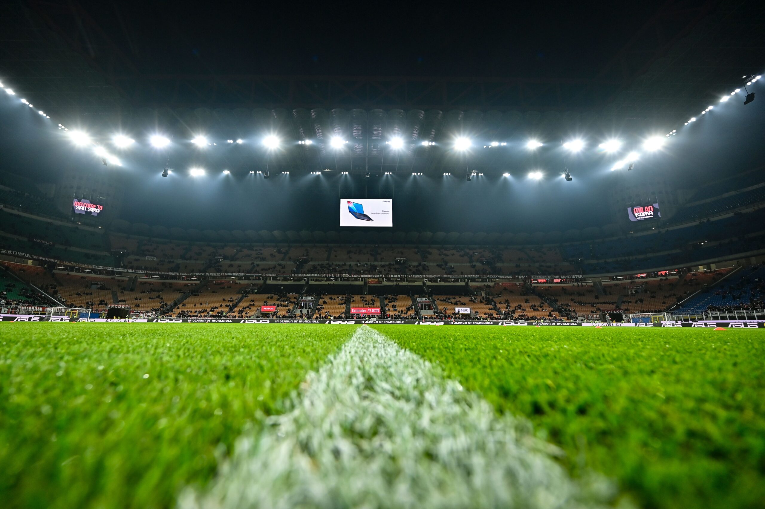 MILAN, ITALY - FEBRUARY 05: General view inside the stadium before the Coppa Italia Quarter Final match between AC Milan and AS Roma at Stadio Giuseppe Meazza on February 05, 2025 in Milan, Italy. (Photo by Diego Puletto/AC Milan via Getty Images)