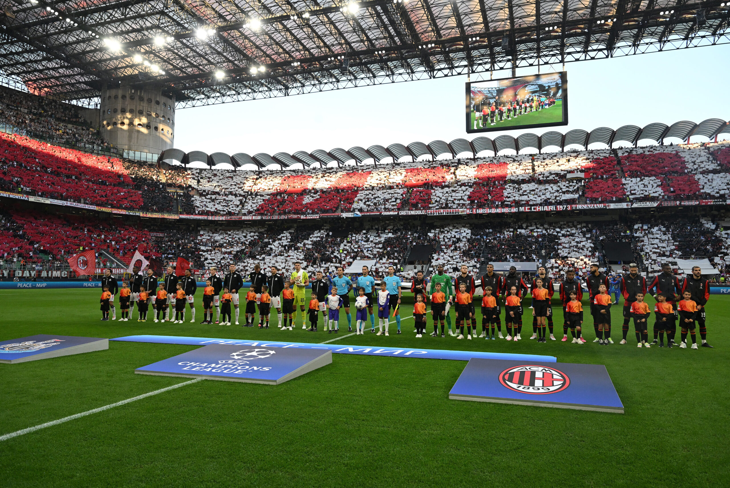 MILAN, ITALY - SEPTEMBER 19: Players of AC Milan and players of Newcastle United FC line up prior to the UEFA Champions League match between AC Milan and Newcastle United FC at Stadio Giuseppe Meazza on September 19, 2023 in Milan, Italy. (Photo by Claudio Villa/AC Milan via Getty Images)