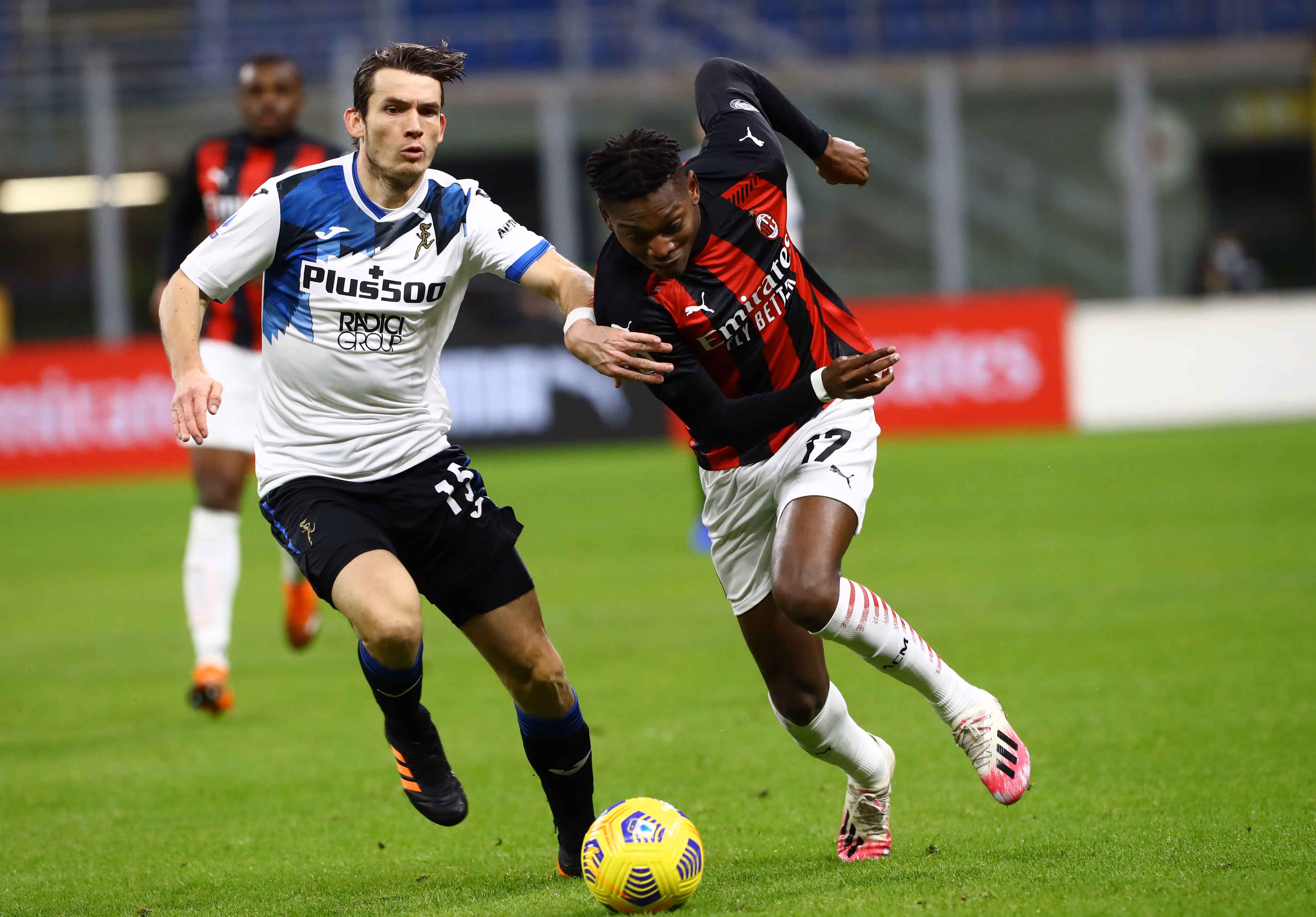 MILAN, ITALY - JANUARY 23: Rafael Leao of Milan is challenged by Marten de Roon of Atalanta during the Serie A match between AC Milan and Atalanta BC at Stadio Giuseppe Meazza on January 23, 2021 in Milan, Italy. Sporting stadiums around Italy remain under strict restrictions due to the Coronavirus Pandemic as Government social distancing laws prohibit fans inside venues resulting in games being played behind closed doors. (Photo by Marco Luzzani/Getty Images)