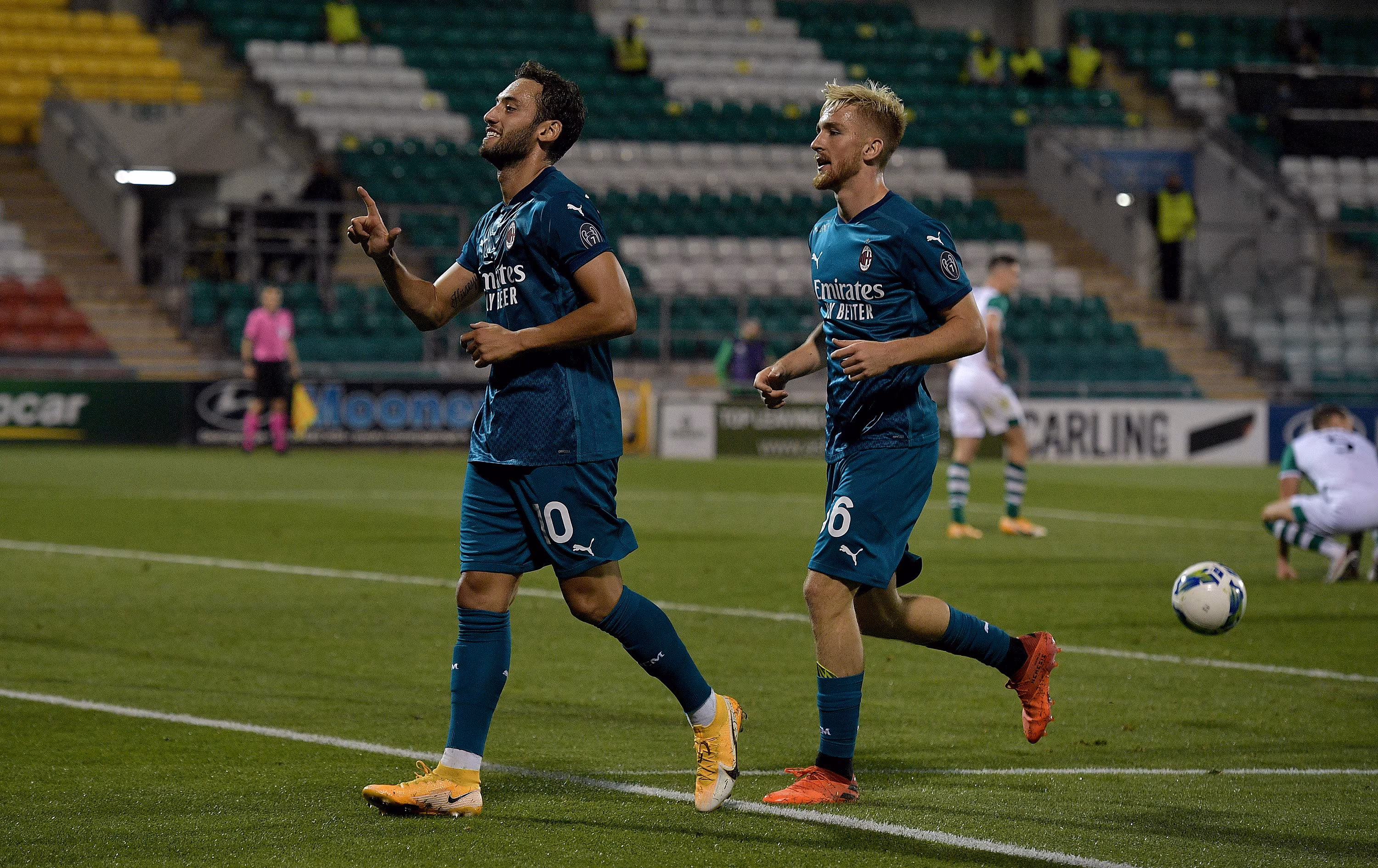 TALLAGHT, IRELAND - SEPTEMBER 17: Hakan Calhanoglu of AC Milan celebrates with teammates after scoring his team's second goal during the UEFA Europa League second qualifying round match between Shamrock Rovers and AC Milan at Tallaght Stadium on September 17, 2020 in Tallaght, Ireland. (Photo by Charles McQuillan/Getty Images)