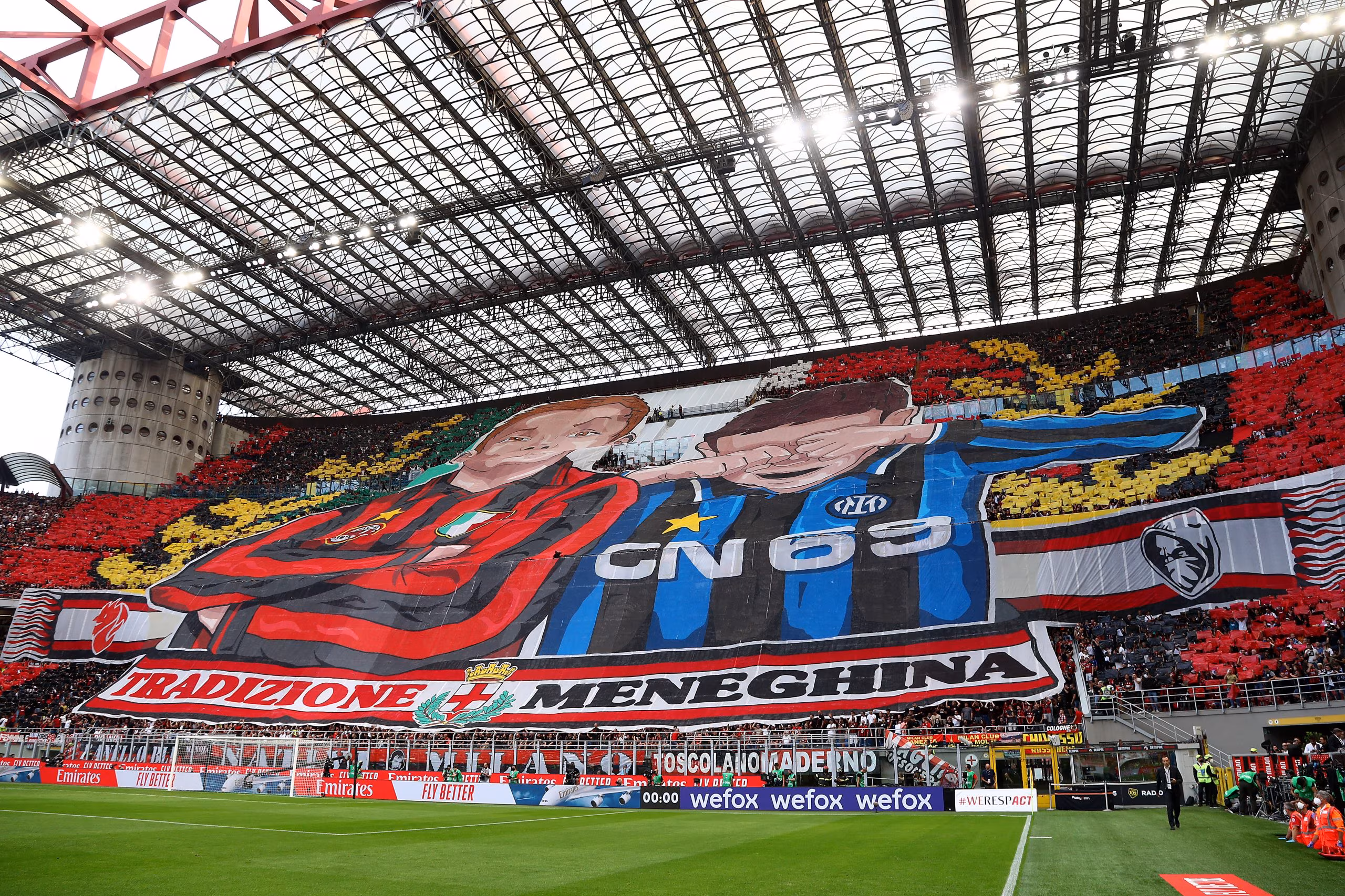 MILAN, ITALY - SEPTEMBER 03: A general view as fans raise a TIFO on the inside of the stadium prior to kick off of the Serie A match between AC Milan and FC Internazionale at Stadio Giuseppe Meazza on September 03, 2022 in Milan, Italy. (Photo by Marco Luzzani/Getty Images)