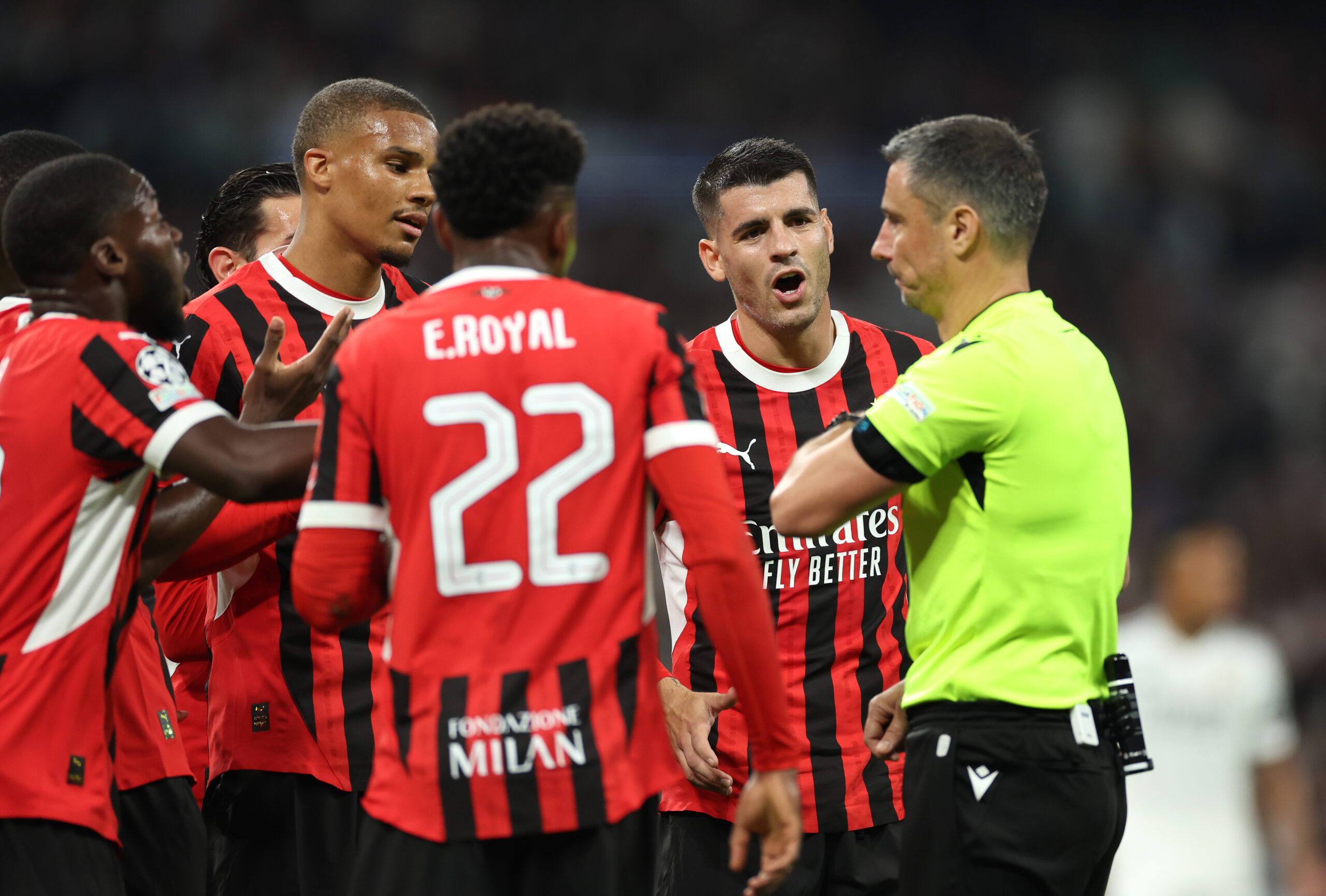 MADRID, SPAIN - NOVEMBER 05: Alvaro Morata protests in the direction of Referee Slavko Vincic during the UEFA Champions League 2024/25 League Phase MD4 match between Real Madrid C.F. and AC Milan at Estadio Santiago Bernabeu on November 05, 2024 in Madrid, Spain. (Photo by Florencia Tan Jun/Getty Images)