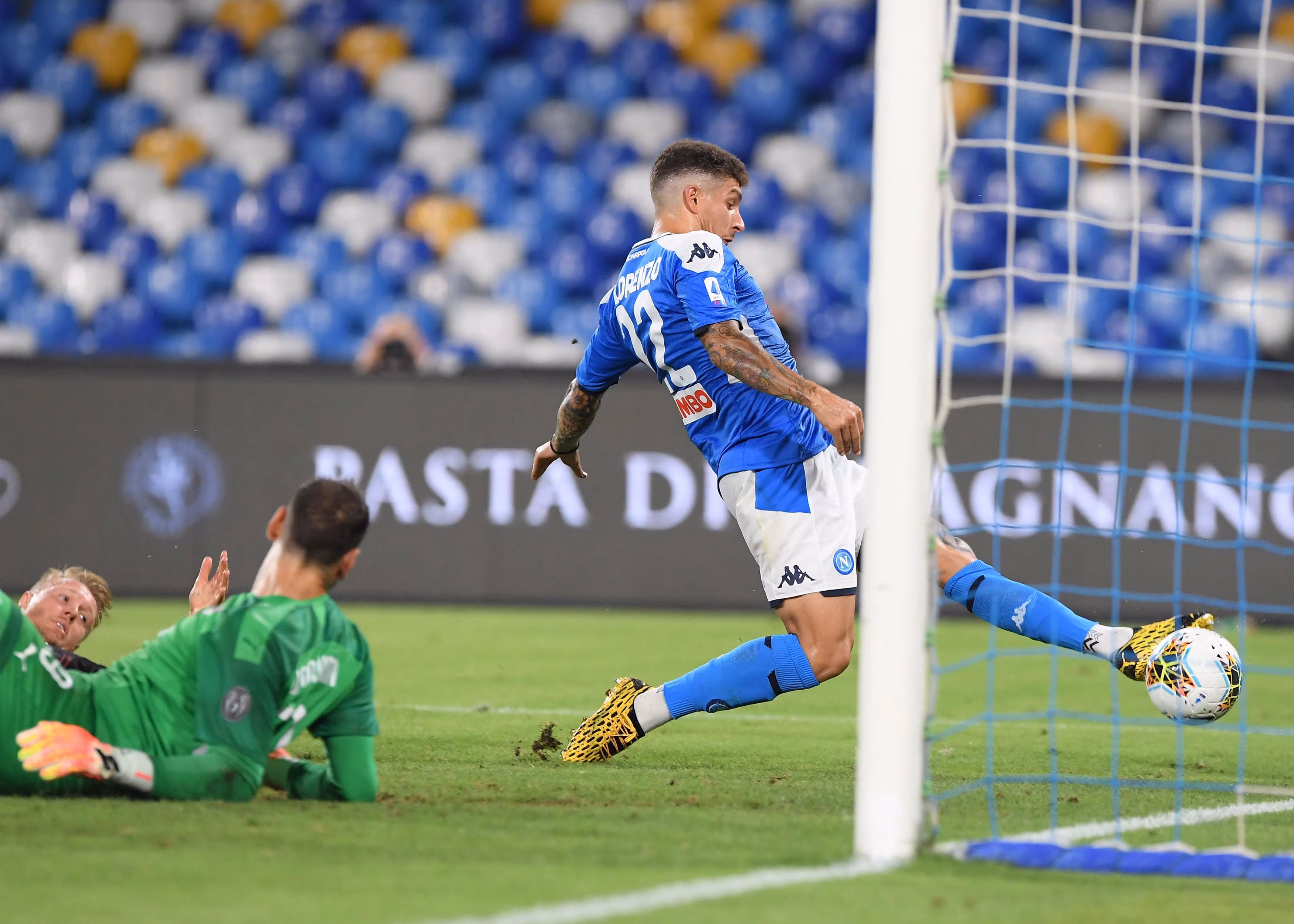 NAPLES, ITALY - JULY 12: Giovanni Di Lorenzo of Napoli scores the 1-1 goal during the Serie A match between SSC Napoli and AC Milan at Stadio San Paolo on July 12, 2020 in Naples, Italy. (Photo by SSC NAPOLI/SSC NAPOLI via Getty Images)