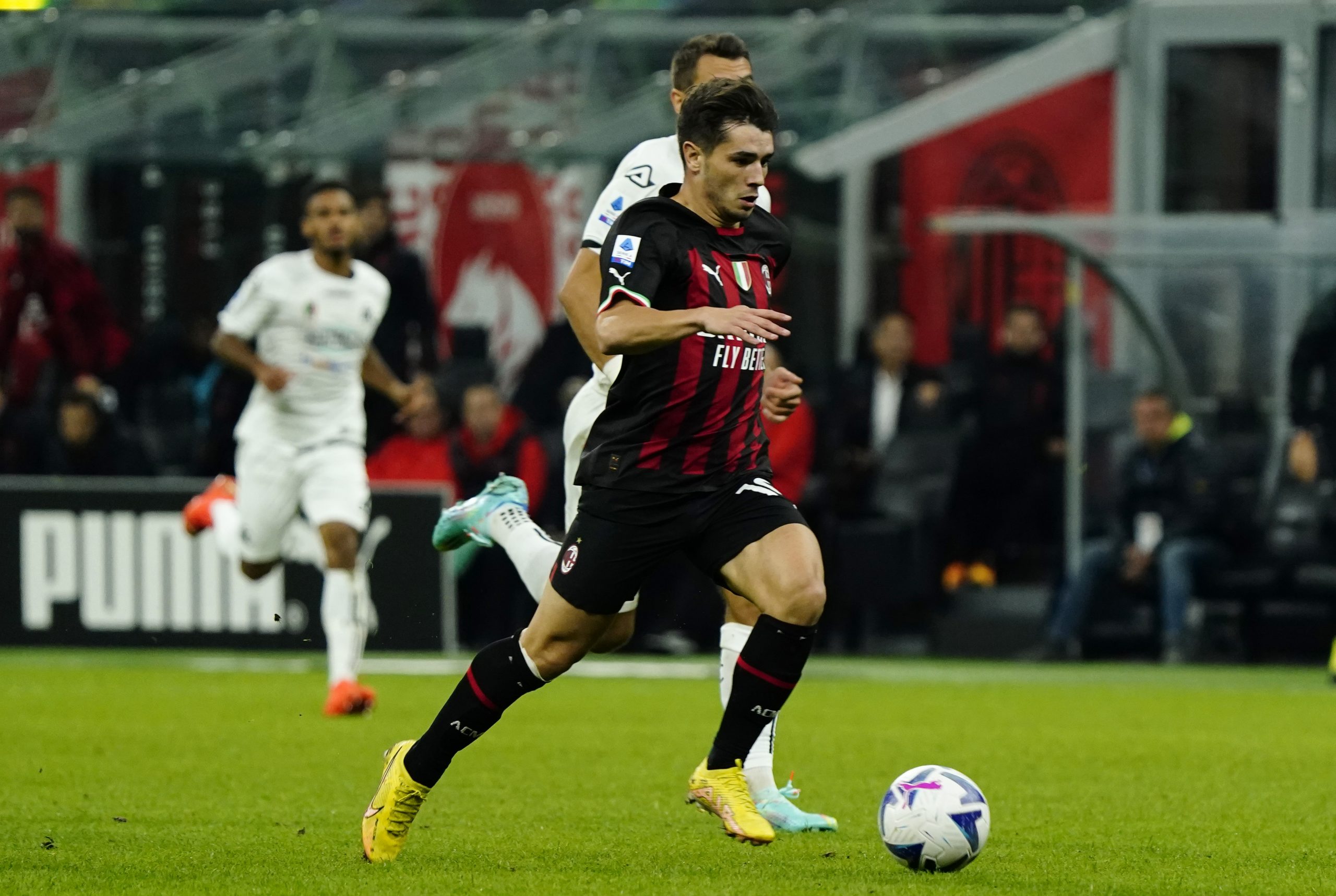 MILAN, ITALY - NOVEMBER 05: Brahim Díaz of AC Milan runs for the ball during the Serie A match between AC MIlan and Spezia Calcio at Stadio Giuseppe Meazza on November 05, 2022 in Milan, Italy. (Photo by Pier Marco Tacca/AC Milan via Getty Images)